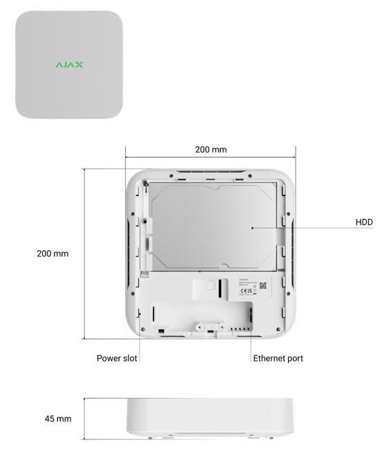 8 channels, up to 4K, H.265/H.264, up to 100 Mbps bandwidth, up to 16 TB 3.5” disk storage (not included). Compatible with all Ajax hubs