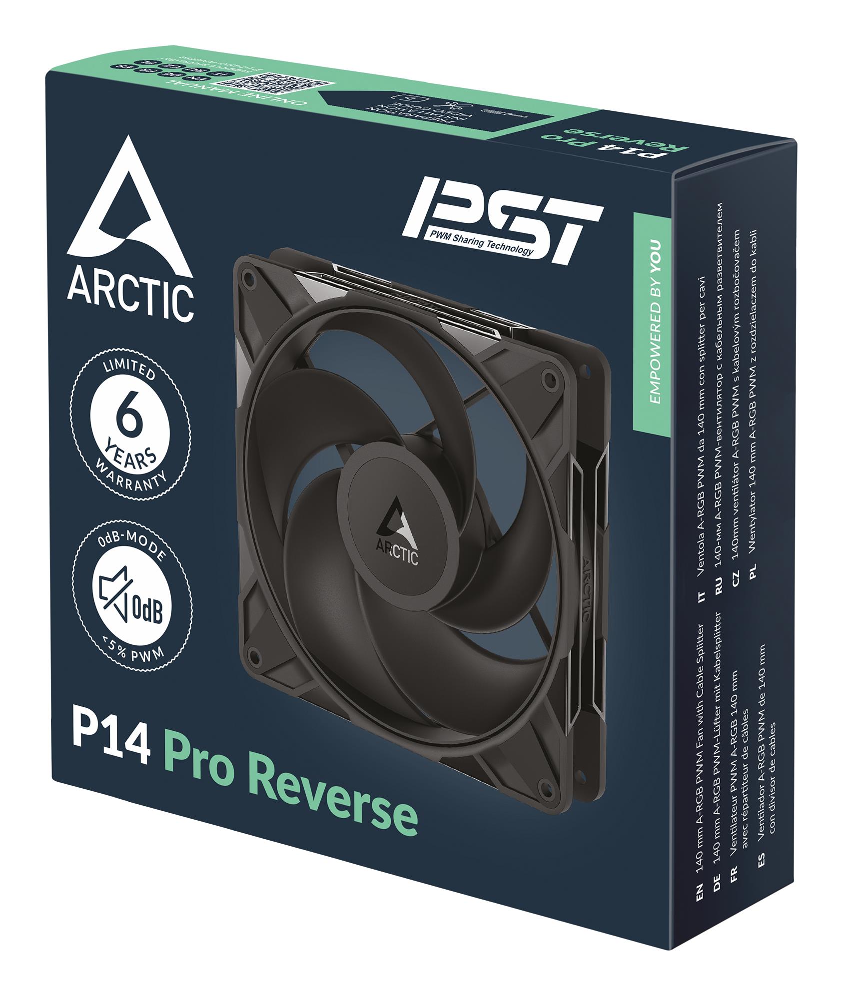 | Summary | ARCTIC Freezer P14 Pro Reverse – 3 Pack – 140 mm A-RGB PWM Fan with Cable Splitter. Type: Fan, Fan diameter: 14 cm, Airflow: 166.5 m³/h, Maximum air pressure: 5.1 mmH2O, Bearing type: Fluid Dynamic Bearing (FDB). Product colour: Black |