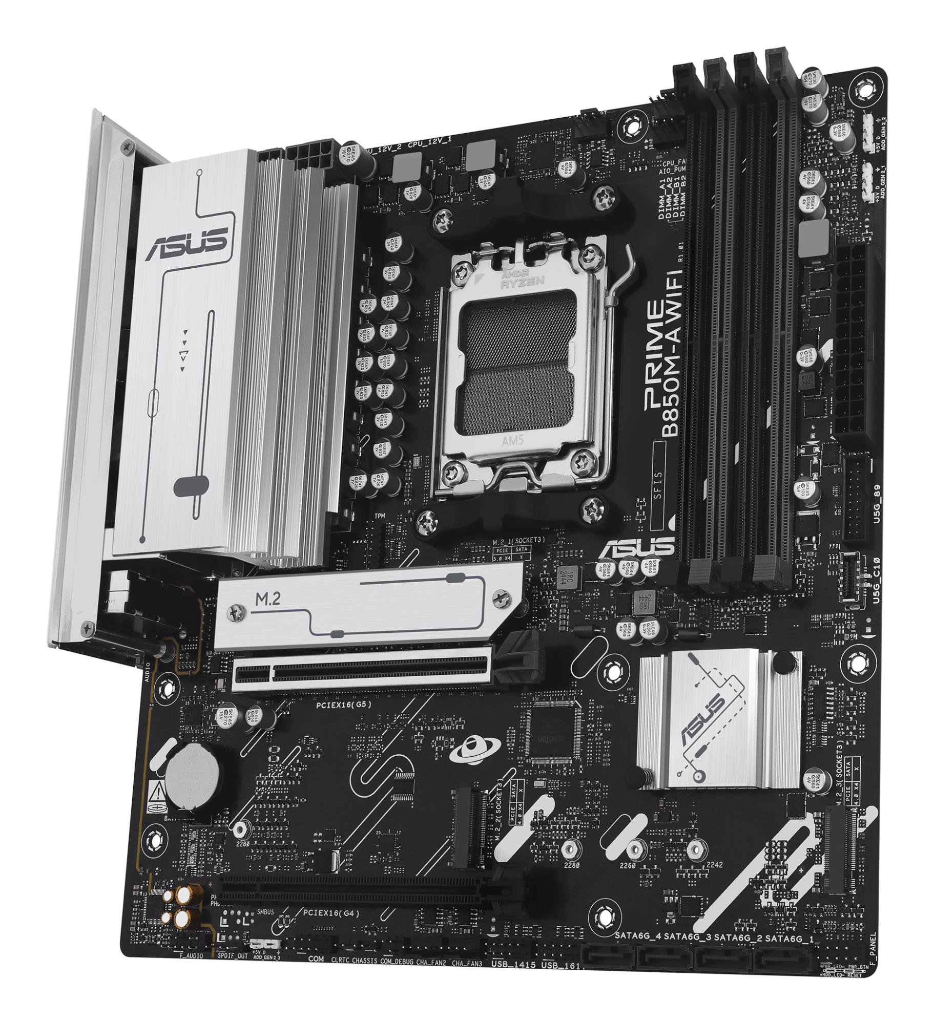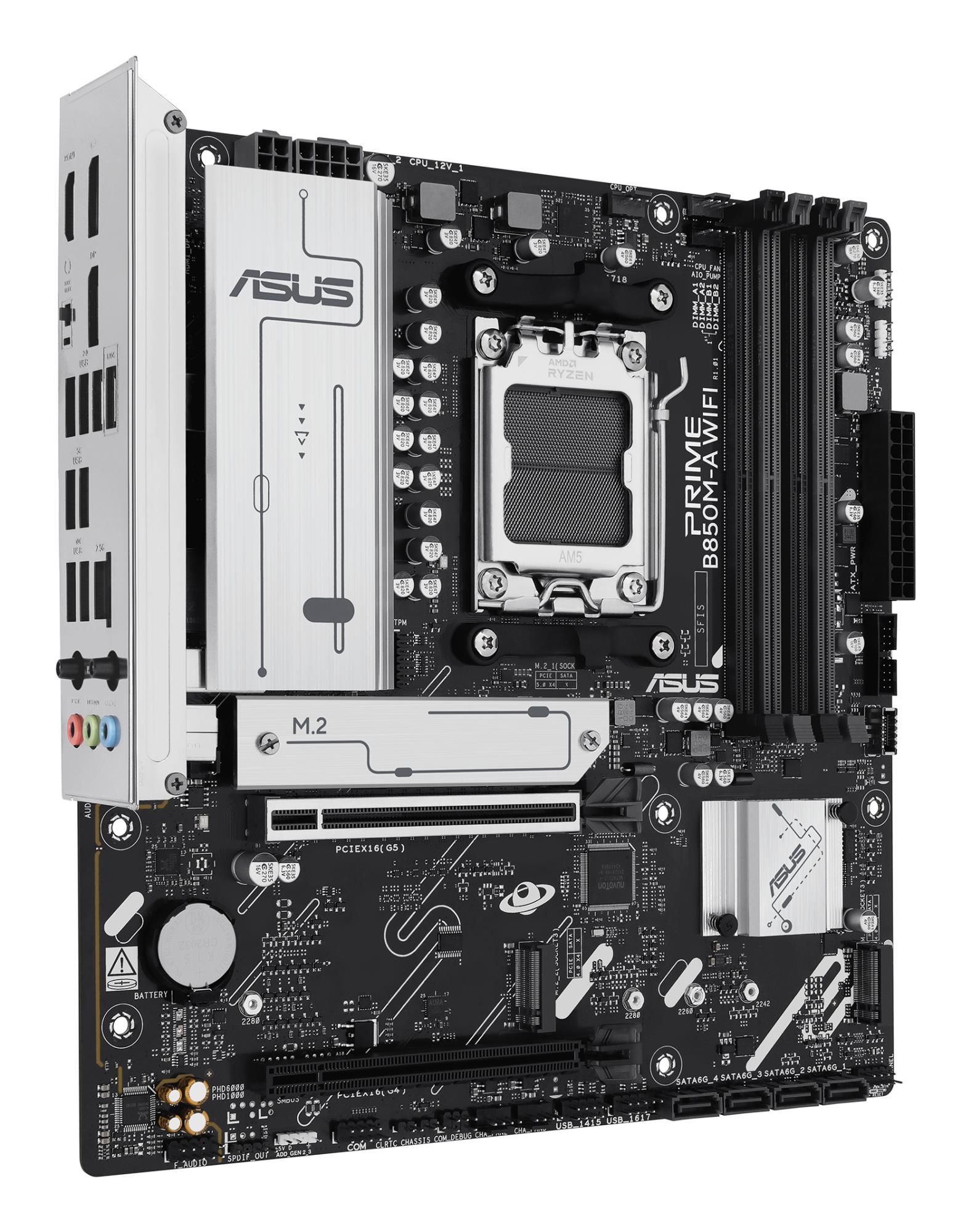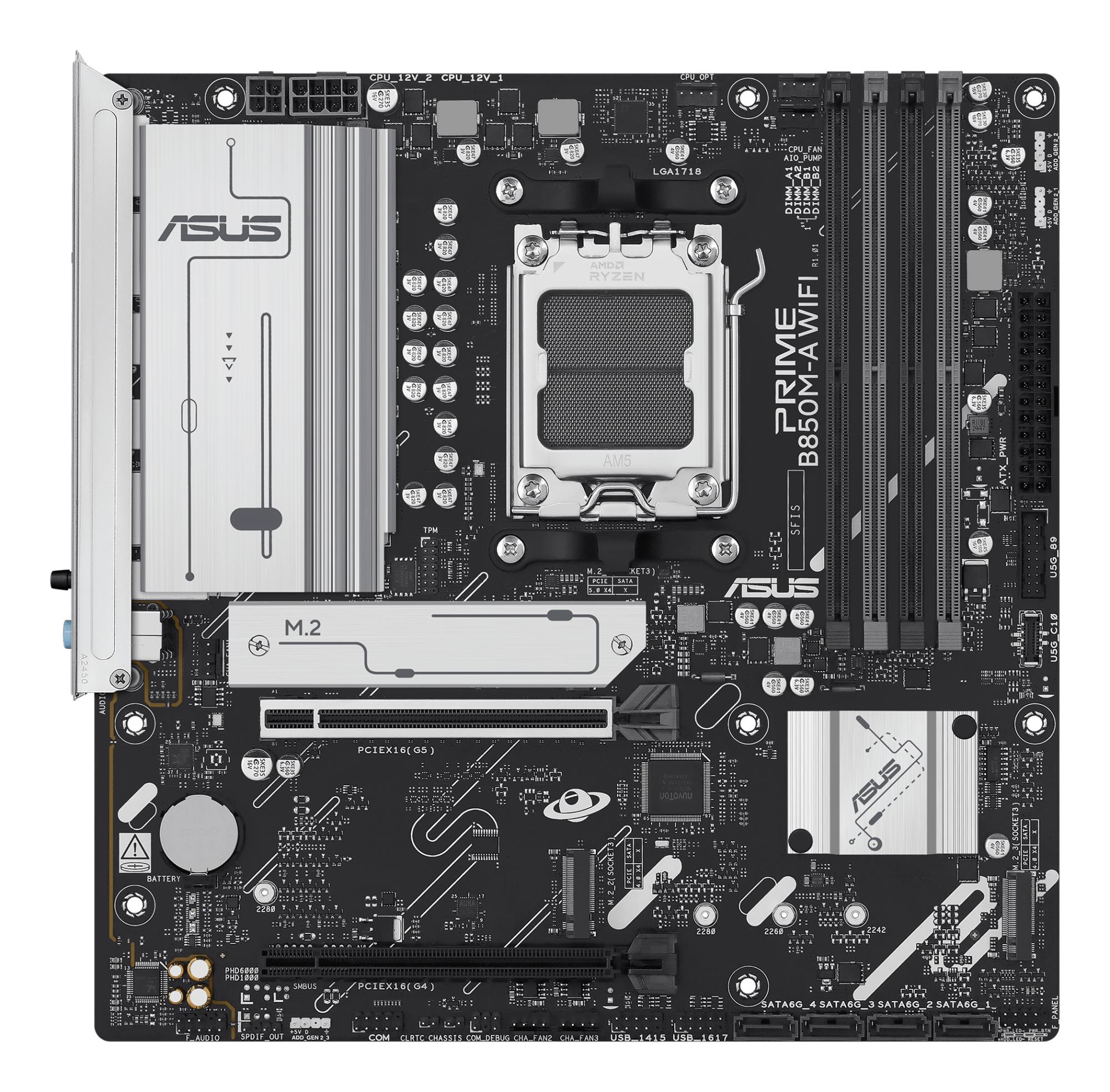 ASUS PRIME B850M-A WIFI. Processor manufacturer: AMD, Processor socket: Socket AM5, Compatible processor series: AMD Ryzen 7000 Series, AMD Ryzen 8000 Series, AMD Ryzen 9000 Series. Supported memory types: DDR5-SDRAM, Maximum internal memory: 256 GB, Memory slots type: DIMM. Supported storage drive interfaces: M.2, SATA III, Supported storage drive types: HDD & SSD, RAID levels: 0, 1, 5, 10. Ethernet interface type: 2.5 Gigabit Ethernet, Fast Ethernet, Gigabit Ethernet, Top Wi-Fi standard: Wi-Fi 6E (802.11ax). Component for: PC, Motherboard form factor: micro ATX, Motherboard chipset family: AMD