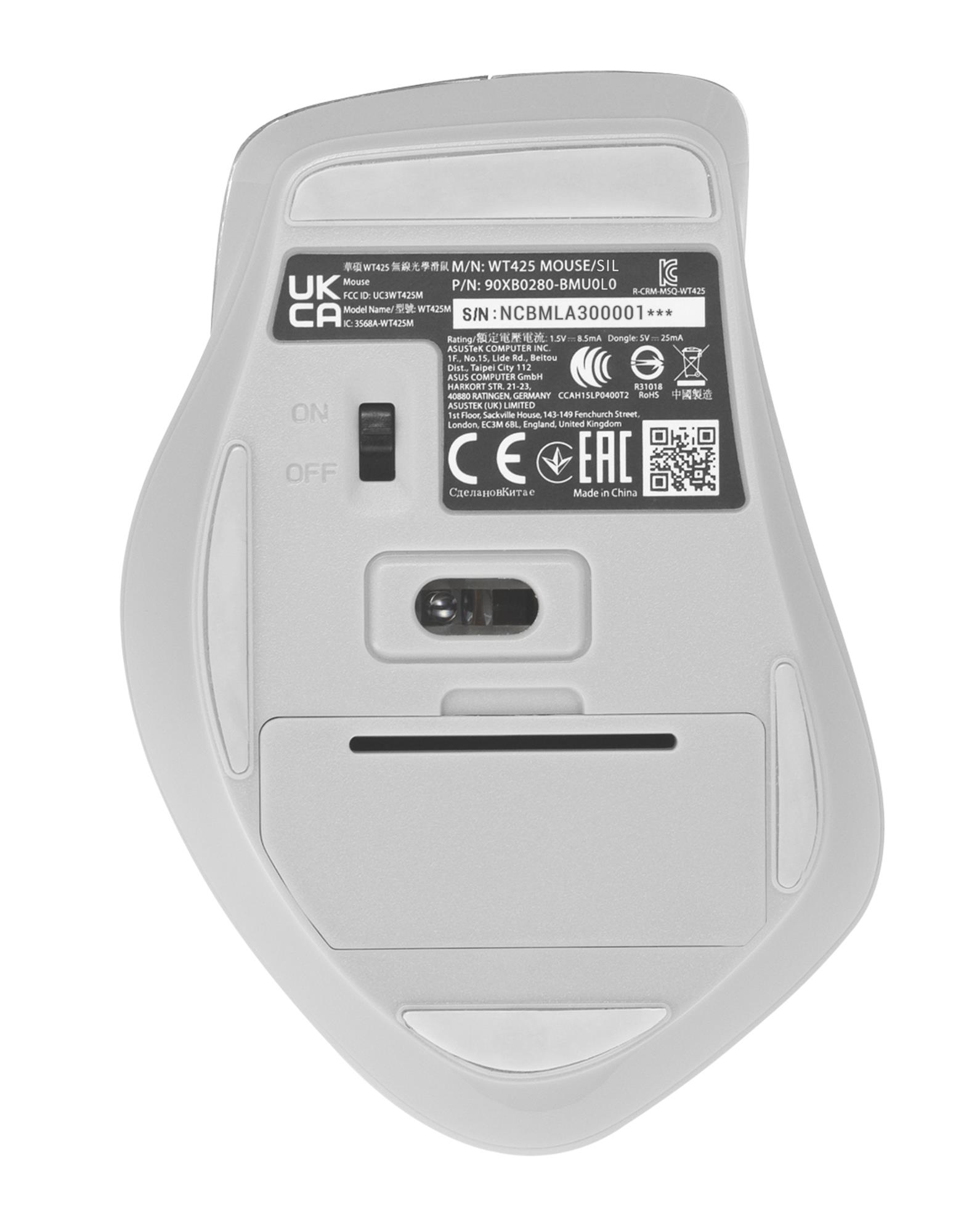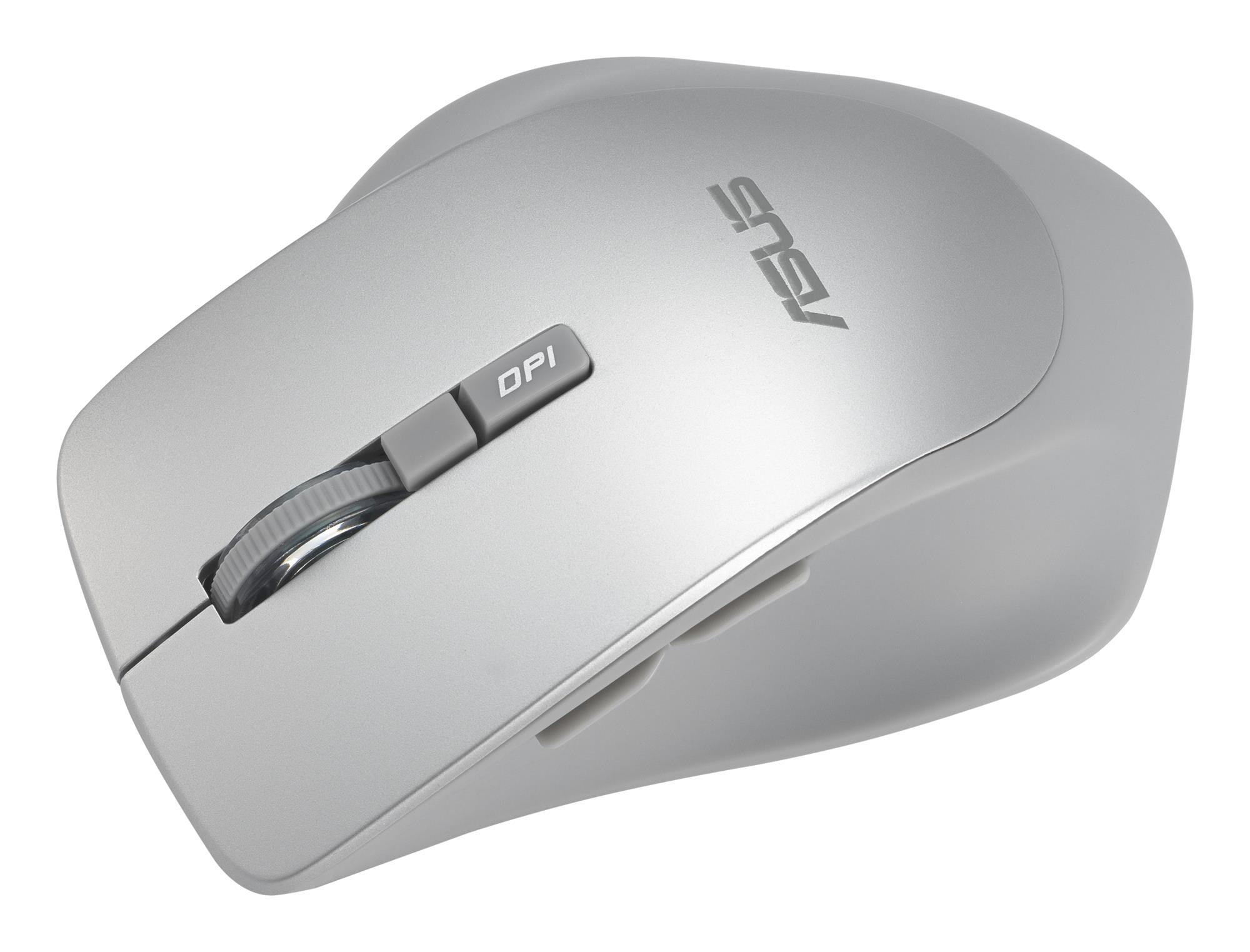 ASUS WT425. Form factor: Right-hand. Movement detection technology: Optical, Device interface: RF Wireless, Movement resolution: 1600 DPI, Scroll type: Wheel. Power source: Batteries. Product colour: Silver