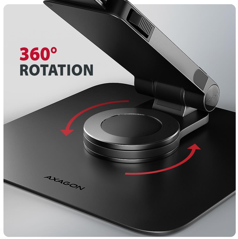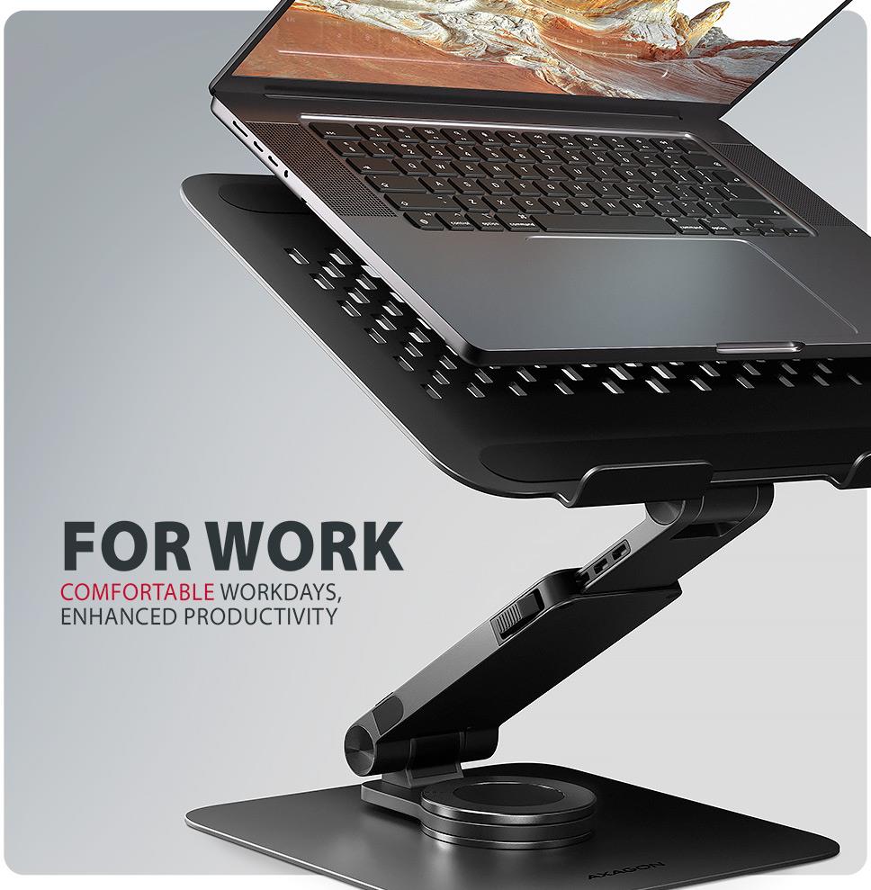 Aluminum stand with 360° rotation for laptops 10"–17.3". Adjustable height and angle. Black version.
