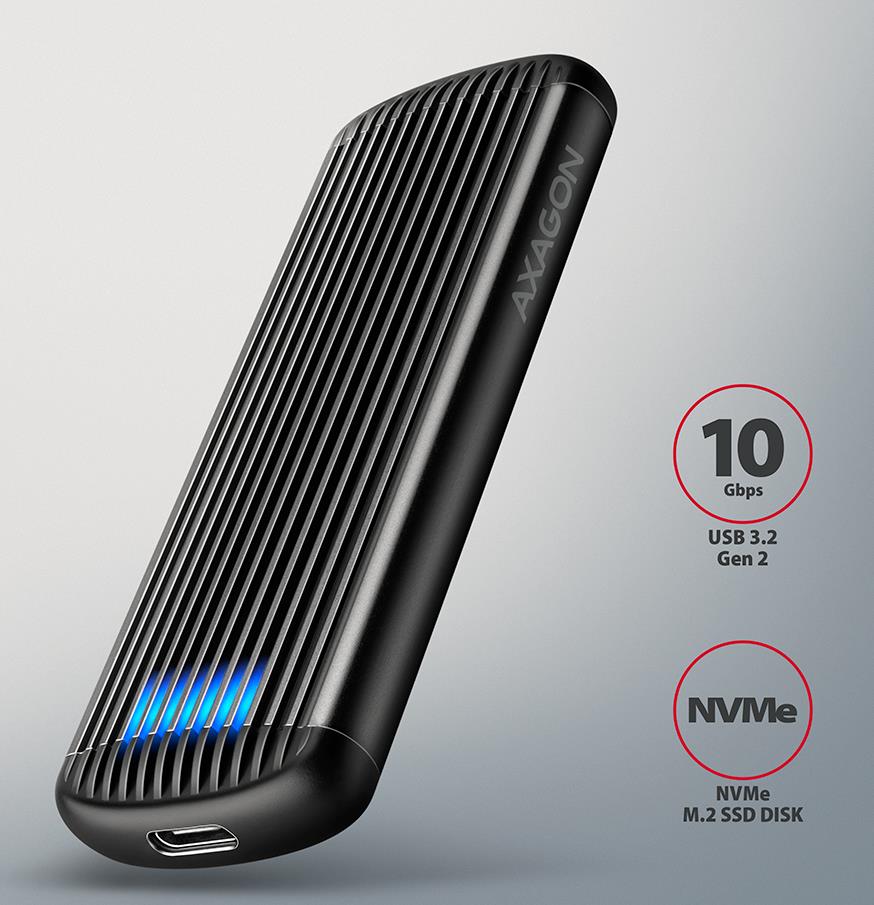 Aluminum external AXAGON EEM2-SC RIBBED box with USB 10Gbps interface designed for M.2 NVMe SSDs. A stable and fast connection is ensured by a reversible USB-C connector. In the package you will find a USB-C -> USB-C cable to connect the box to your computer.