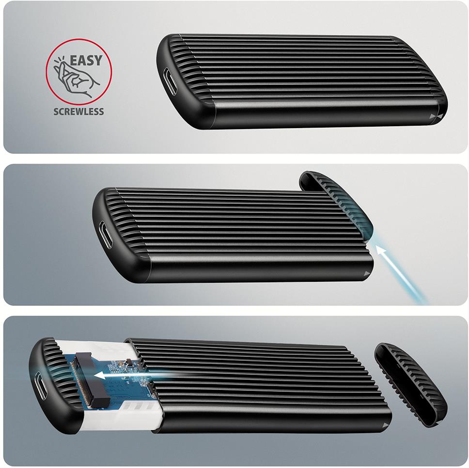 Screwless opening makes installation and removal of the M.2 SSD drive easier. This makes disk replacement quick and easy, significantly speeding up data migration, testing, cloning, and storage expansion.