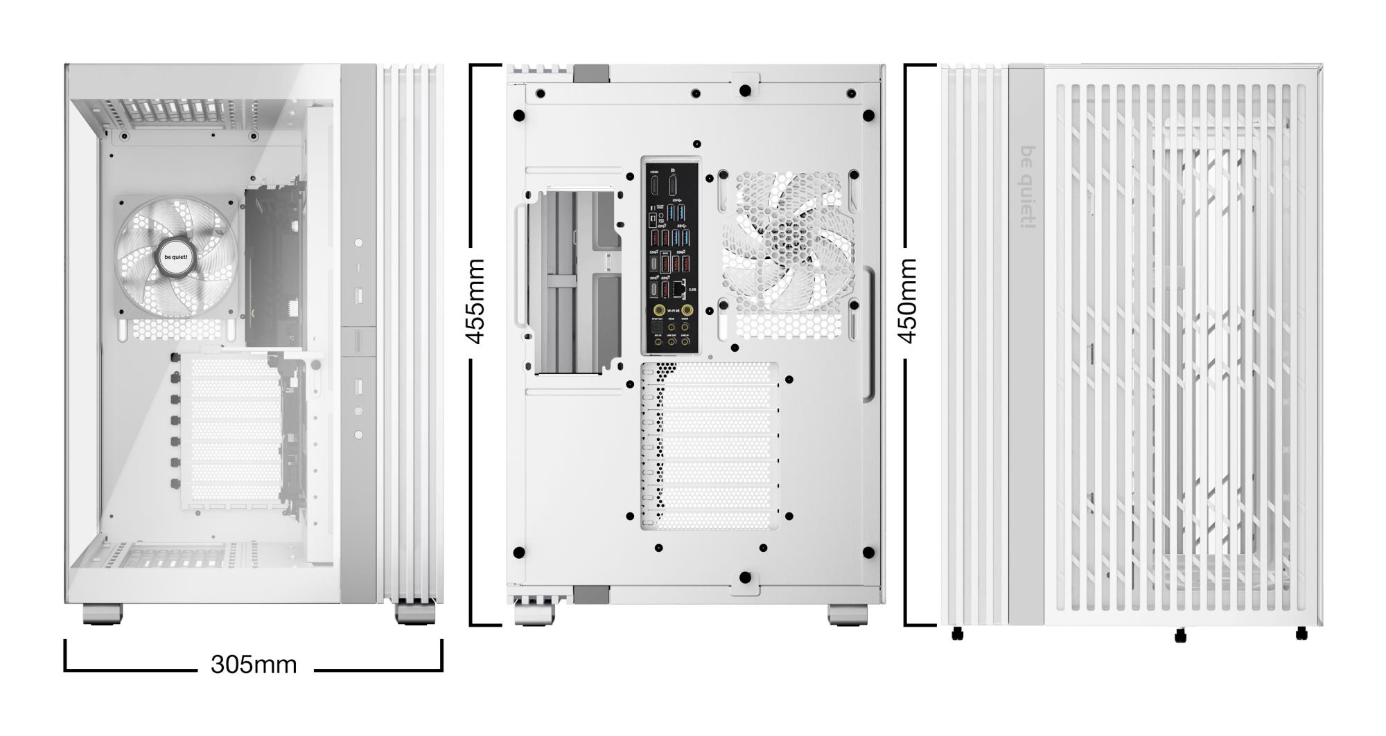 be quiet! LIGHT BASE 600 LX White. Form factor: Midi Tower, Type: PC, Product colour: White. Supported power supply form factors: ATX, PS2. Side fans installed: 3x 120 mm, Side fans diameters supported: 120 mm, Rear fans installed: 1x 120 mm. Supported HDD sizes: 2.5,3.5". Width: 305 mm, Depth: 450 mm, Height: 455 mm