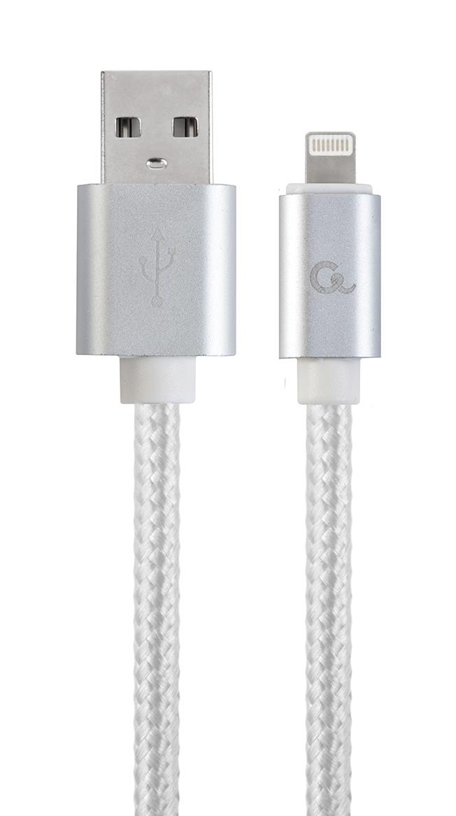 Cotton braided 8-pin cable with metal connectors, 1.8 m, silver color, blister