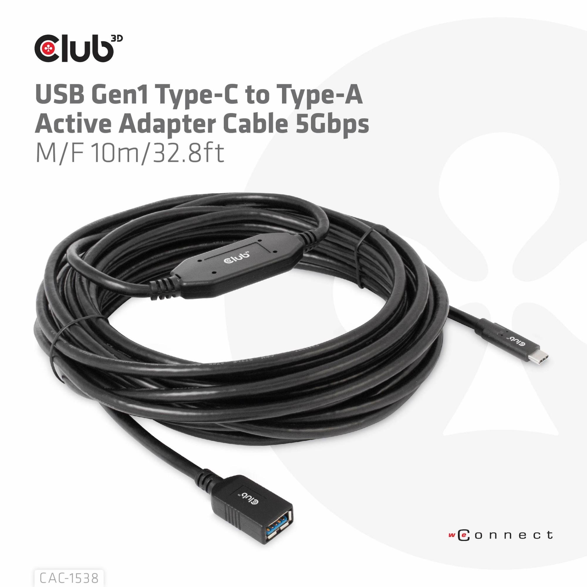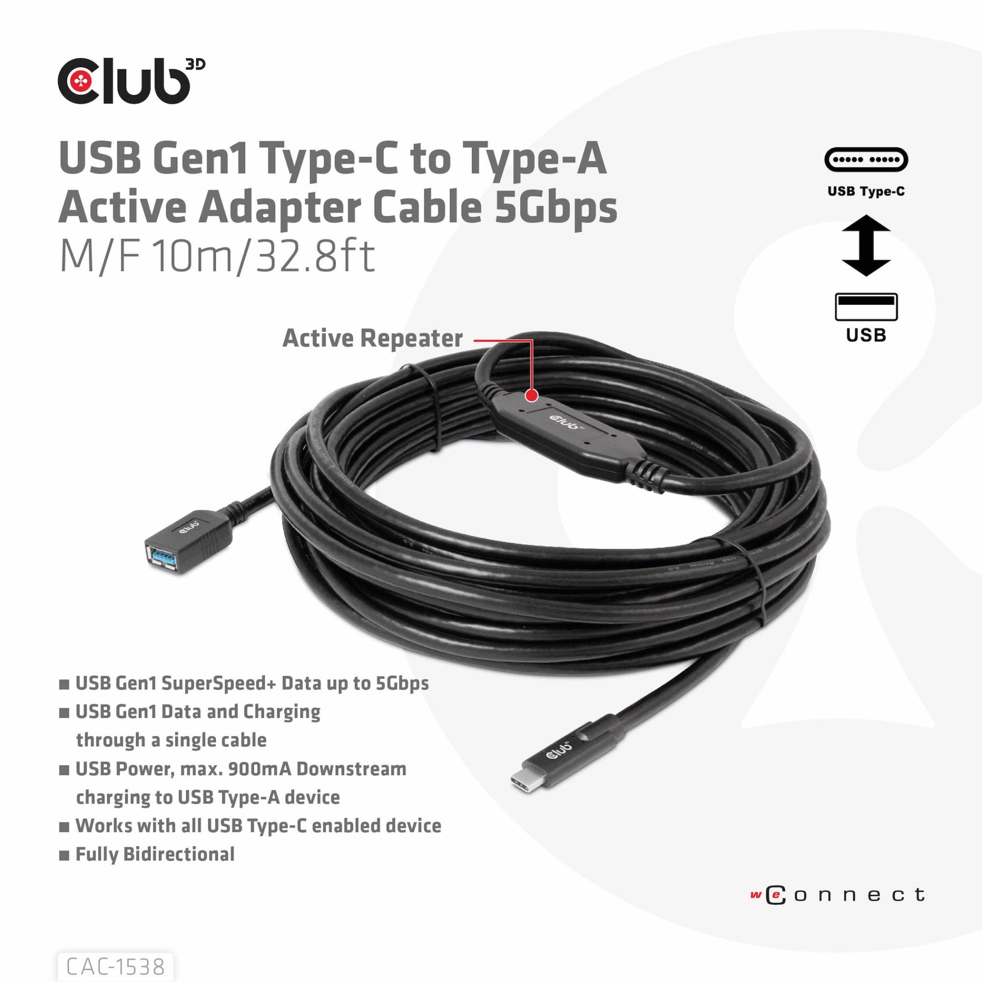 The Club 3D CAC-1538 USB Gen1 Type-C to Type-A Active Adapter Cable 5Gbps M/F 10m/32.8ft connects your Notebook, Tablet or Phone with USB Type-C output to your favorite existing Peripherals, Accessories and Chargers featuring the common USB Type-A plug. It enables Data and Power over a single cable. This cable supports USB 3.2 Gen1. SuperSpeed+ data up to 5Gbps and up to 900mA output for Downstream charging or powering your USB Type-A enabled Notebook, Tablet or Smartphone.