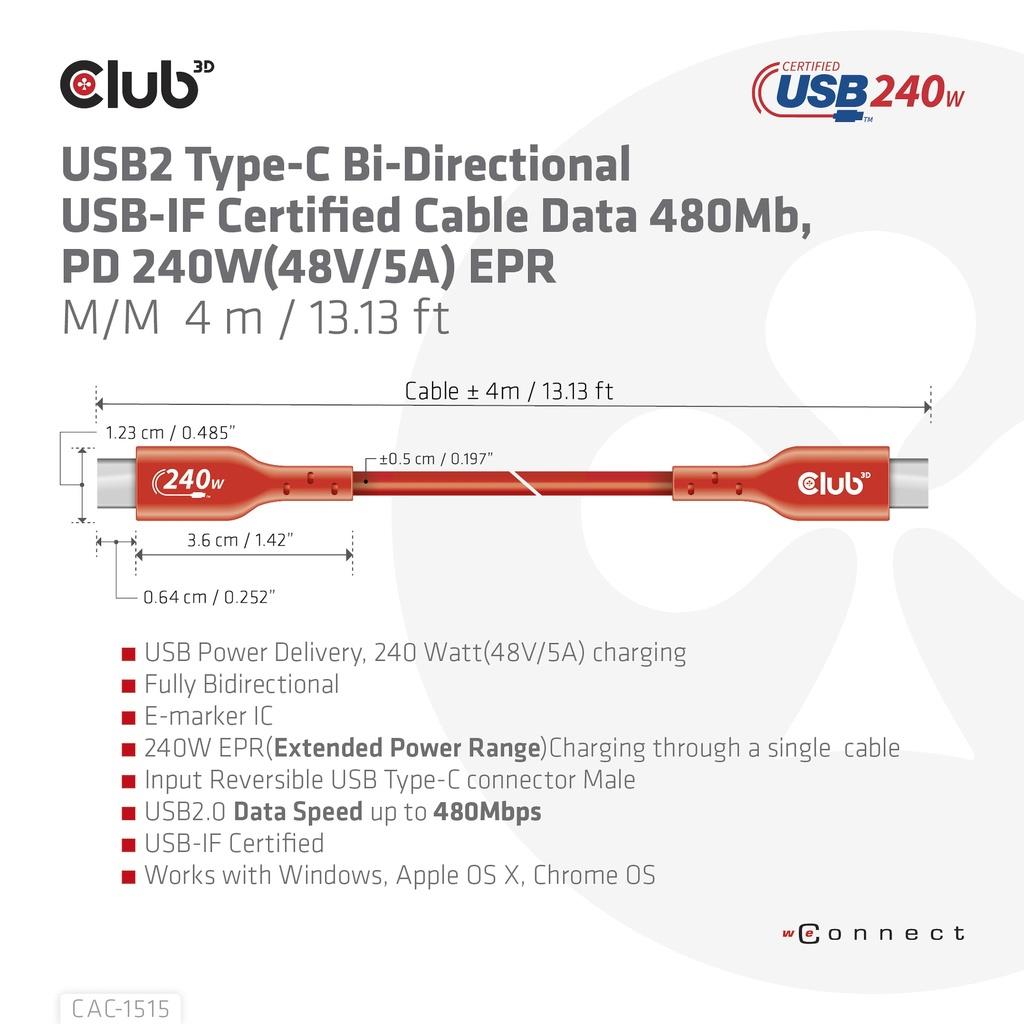 The Club 3D CAC-1515 USB2.0 Type-C Bi-Directional USB-IF Certified Cable, Data 480Mb, PD 240W(48V/5A) EPR, Extended Power Range M/M 4 m / 13.13 ft connects your Notebook, Tablet or Phone with USB Type-C output to your favorite existing Peripherals, Accessories and Chargers. It enables Data and Power over a single cable and both ways. This cable supports USB2.0 data up to 480Mbps and up to 240Watt(48V/5A) output for Downstream charging or powering your Notebook, Tablet or Smartphone.