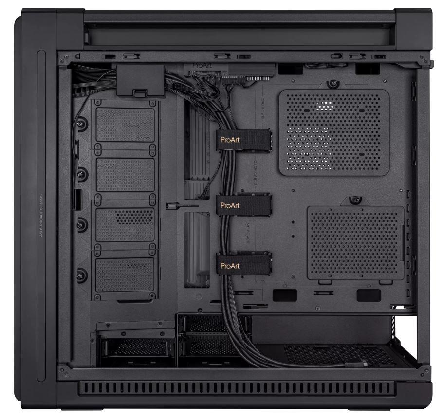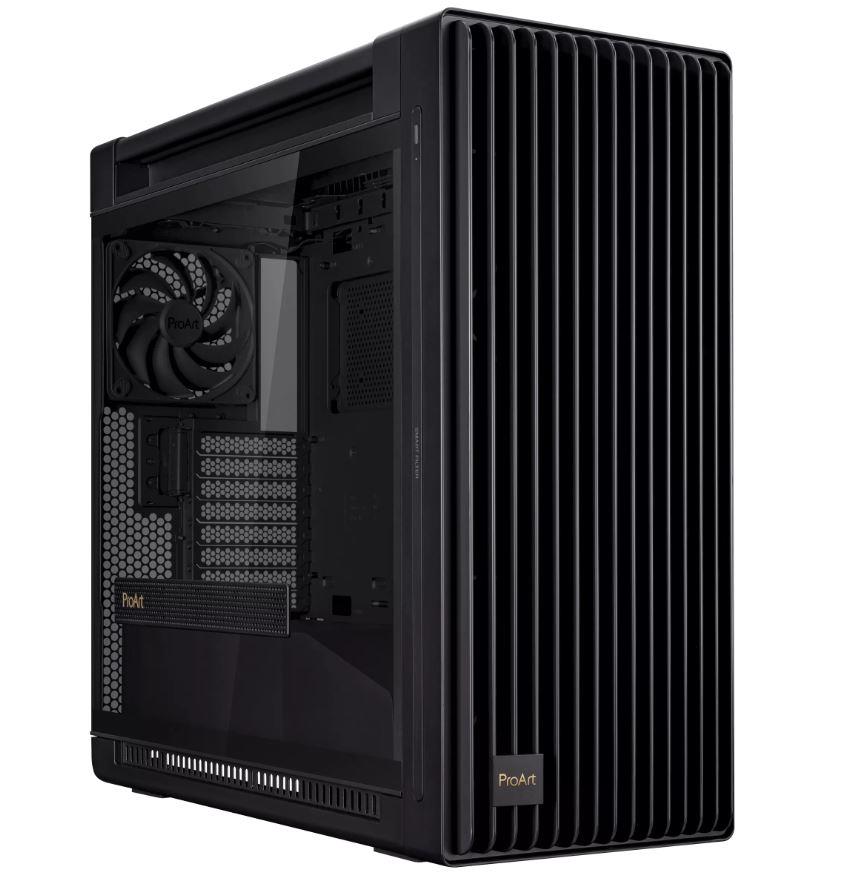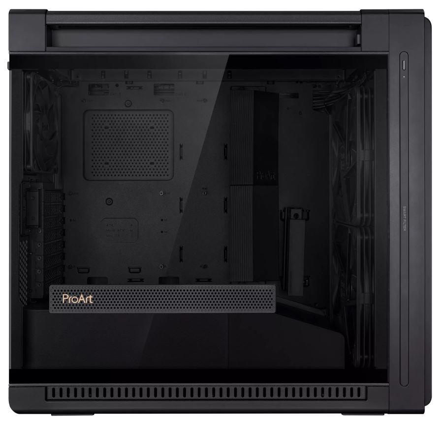 ProArt PA602 E-ATX computer case, 420 mm radiator support, one 140 mm and two 200mm pre-installed system fans, front panel IR dust indicator, power lock latch, tool-less PCIe mounting, USB 20Gbps support