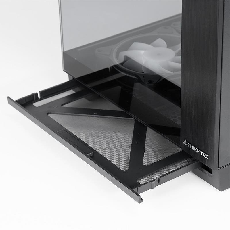 The case comes with six pre-installed 120mm A-RGB fans and a control hub for motherboard synchronization of A-RGB and PWM fan speed control. 5 of these fans are designed with reverse airflow fan blades to enable the optimum intake on the sides and the bottom without sacricing on the aesthetics. Designed with gamers in mind, the CHIEFTEC Visio provides the opportunity to create a distinctive build.