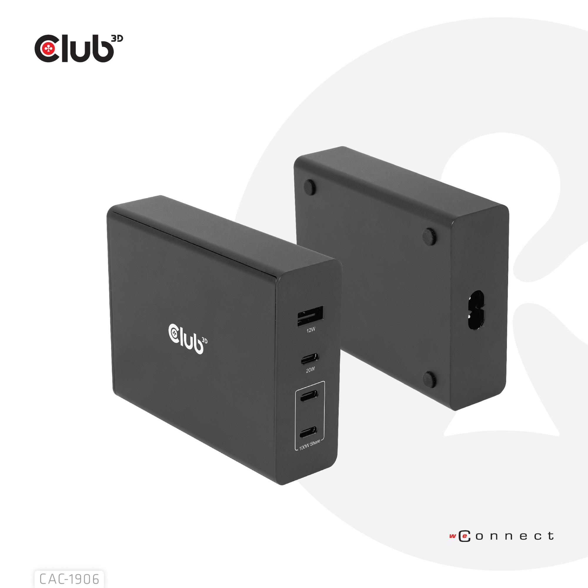 The Club 3D CAC-1906 Travel Charger 132W GAN technology, Four port USB Type-A and -C, Power Delivery(PD) 3.0 Support. This product is a high-performance, low weight travel charger with a maximum output power of 132W. Equipped with 3 USB Type-C ports and 1 Type-A port, the total output supports up to 132W, which can meet the needs of charging four devices at the same time. Compatible with multiple devices (support mobile phones,tablets and laptops). It is a convenient companion during travel and for business! Compact size & Superior Performance: GAN technology makes this charger 50% smaller than a 132W MacBook charger, small enough to carry anywhere.The 132W wall charger match a variety of PD devices from smart phones to laptops, one for all making charging simple. The Power Charger is light weight without compromising on Quality and safety. By adopting Power Delivery(PD) charging technology, this versatile Power Charger provides you with charging function through USB Type-C interface, you can charge any connected Mobilephone / Tablet / NoteBook.