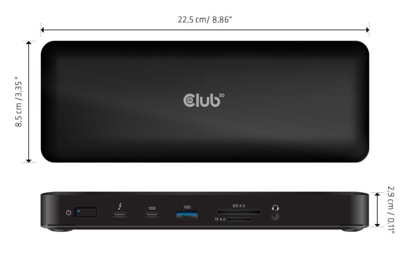 Summary: CLUB3D CSV-1583. Connectivity technology: Wired, Host interface: Thunderbolt 4. Product colour: Black, Compatible memory cards: MicroSD (TransFlash), SD, Data transfer rate: 40 Gbit/s. Power cable length: 1 m, Thunderbolt 4 cable length: 0.8 m. Windows operating systems supported: Windows 10. Width: 85 mm, Depth: 225 mm, Height: 22 mm