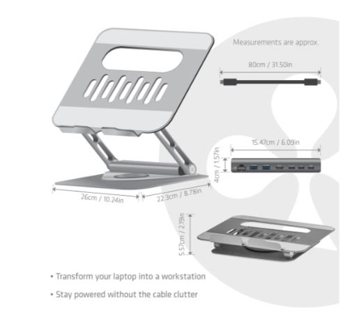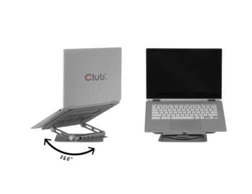 The Club 3D® CSV-2554 is a Laptop Stand designed with a 360° rotating base and adjustable height, allowing you to raise your laptop screen to a more ergonomic viewing position. The hub provides you all basic ports needed for optimal working experience