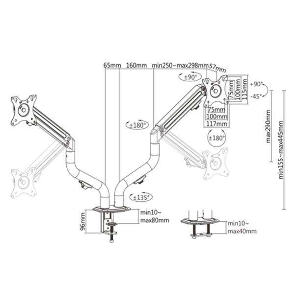 Adjustable desk 2-display mounting arm (tilting), 17”-32”, up to 8 kg