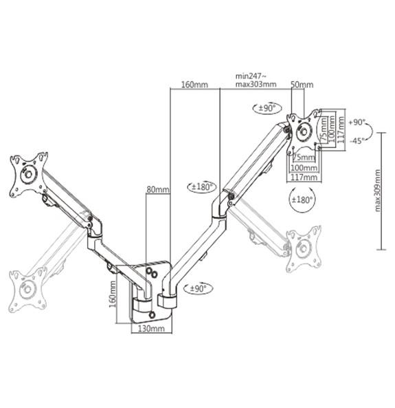 Adjustable wall 2-display mounting arm, 17”-27”, up to 7 kg