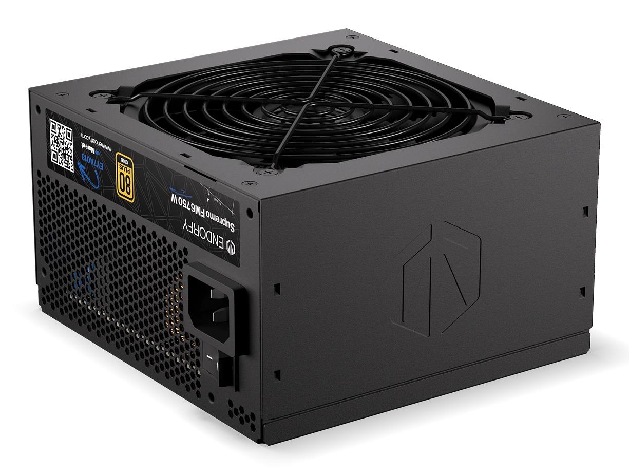 ENDORFY Supremo FM6 750 W. Total power: 750 W, AC input voltage: 100 - 240 V, Input current: 13 - 65 A. Motherboard power connector: 24-pin ATX, Motherboard power cable length: 60 cm, SATA power cable length: 560,880,720 mm. Purpose: PC, Power supply unit (PSU) form factor: ATX, 80 PLUS certification: 80 PLUS Gold. Product colour: Black, Cooling type: Active, Fan diameter: 12 cm. Compliance certificates: CE, Federal Communications Commission (FCC), RoHS, UKCA, WEEE