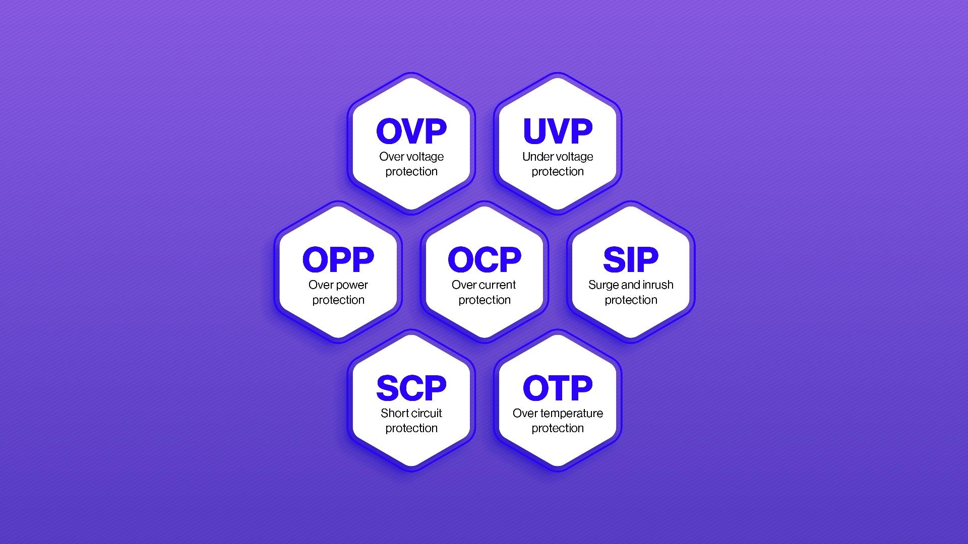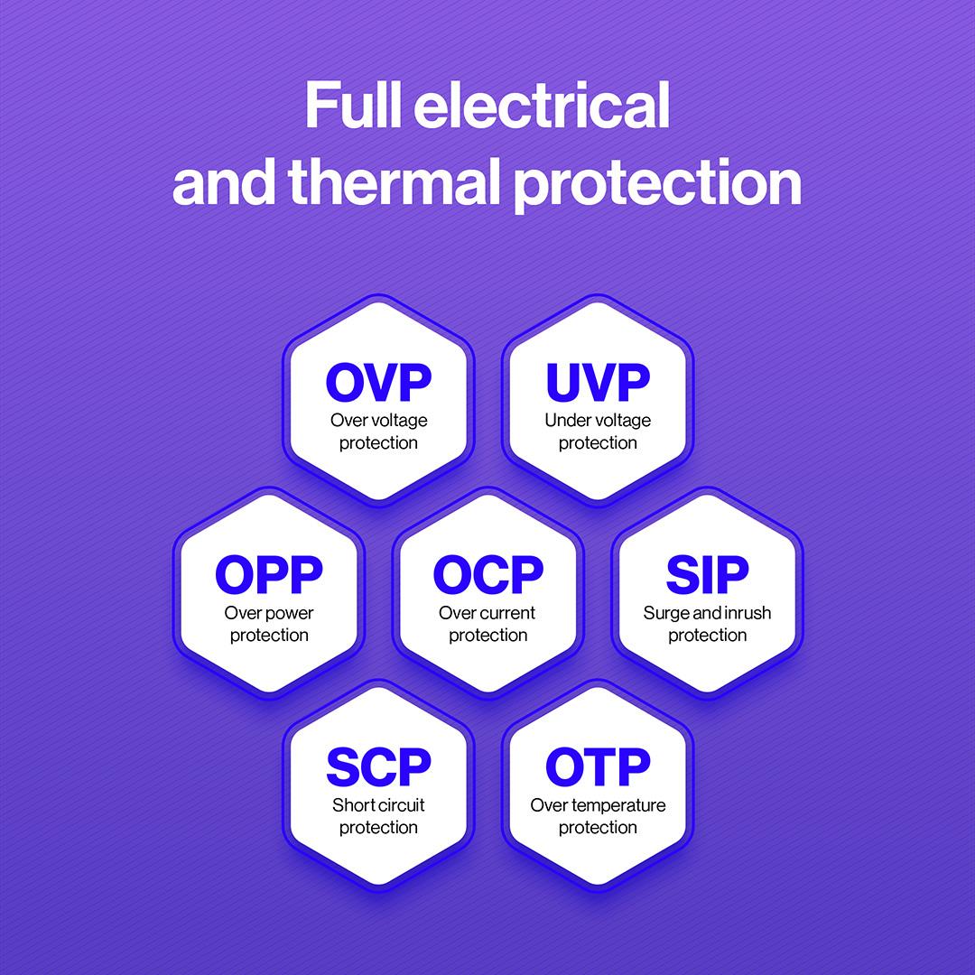Over current/Over power/Over voltage/Overheating/Short circuit/Surge & inrush protection (SIP)/Under voltage