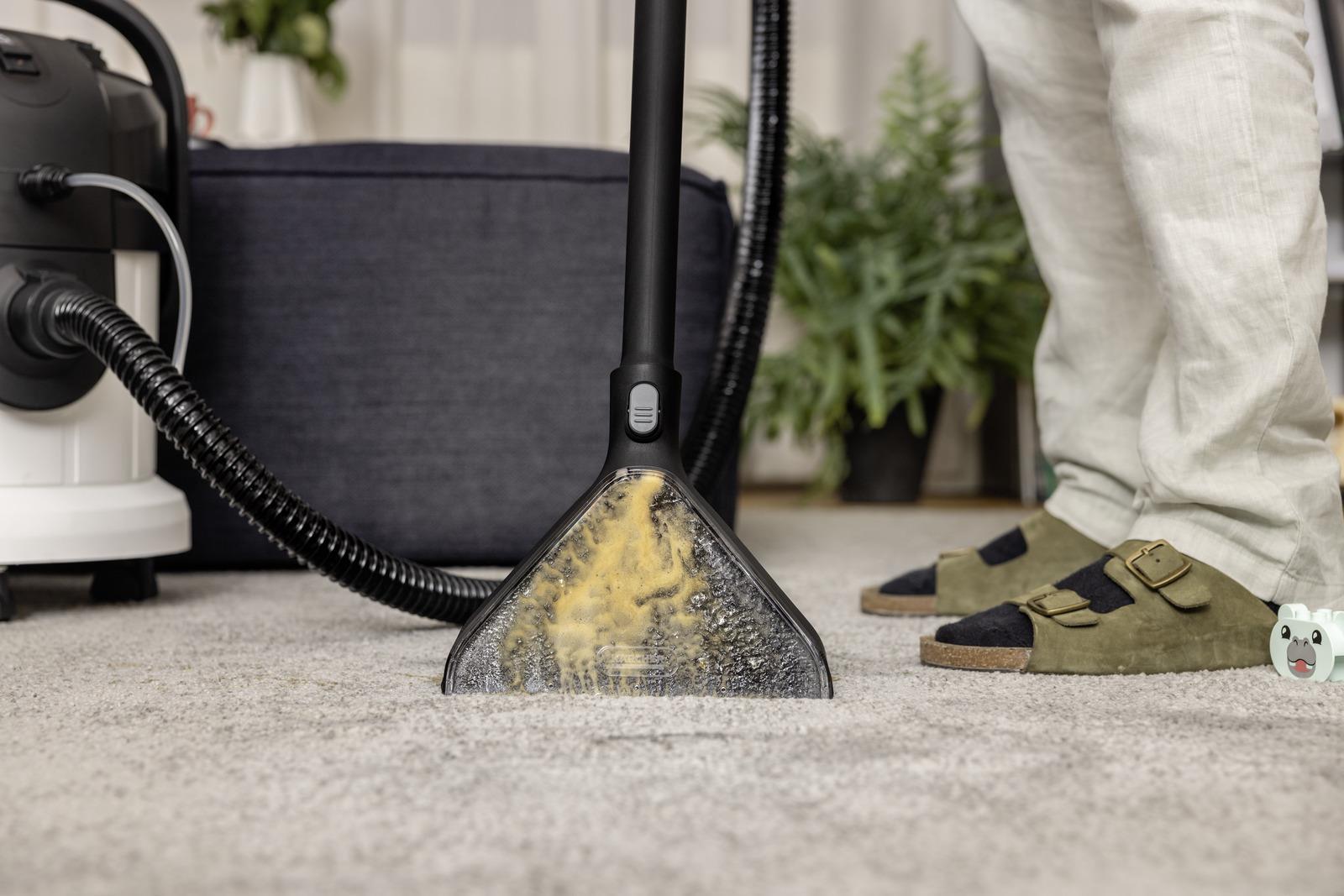 Deep cleaning impact combined with ergonomic design and multifunctionality: the SE 4 spray extraction cleaner with its attractive pull-behind design ensures a hygienic clean right down to the fibres of many textile surfaces. Tried-and-tested spray extraction technology from Kärcher delivers the best cleaning results: fresh tap water and the Kärcher Carpet Cleaner RM 519 are sprayed deep into the textile fibres under pressure and then vacuumed back up together with the loosened dirt – ideal for families, allergy sufferers and households with pets. The device is a multifunctional 3-in-1 product, also working as a fully-fledged wet and dry vacuum cleaner. The large translucent 4-litre fresh water tank is impact-resistant and can be removed, making it is easy to fill and empty. The dirty water that is vacuumed up is collected in the container. The 3-in-1 carrying handle is designed to make carrying, opening, closing and emptying the container hassle-free. The accessories supplied can be neatly stowed away on the device itself. The device is easy to clean after use to ensure a long product life.