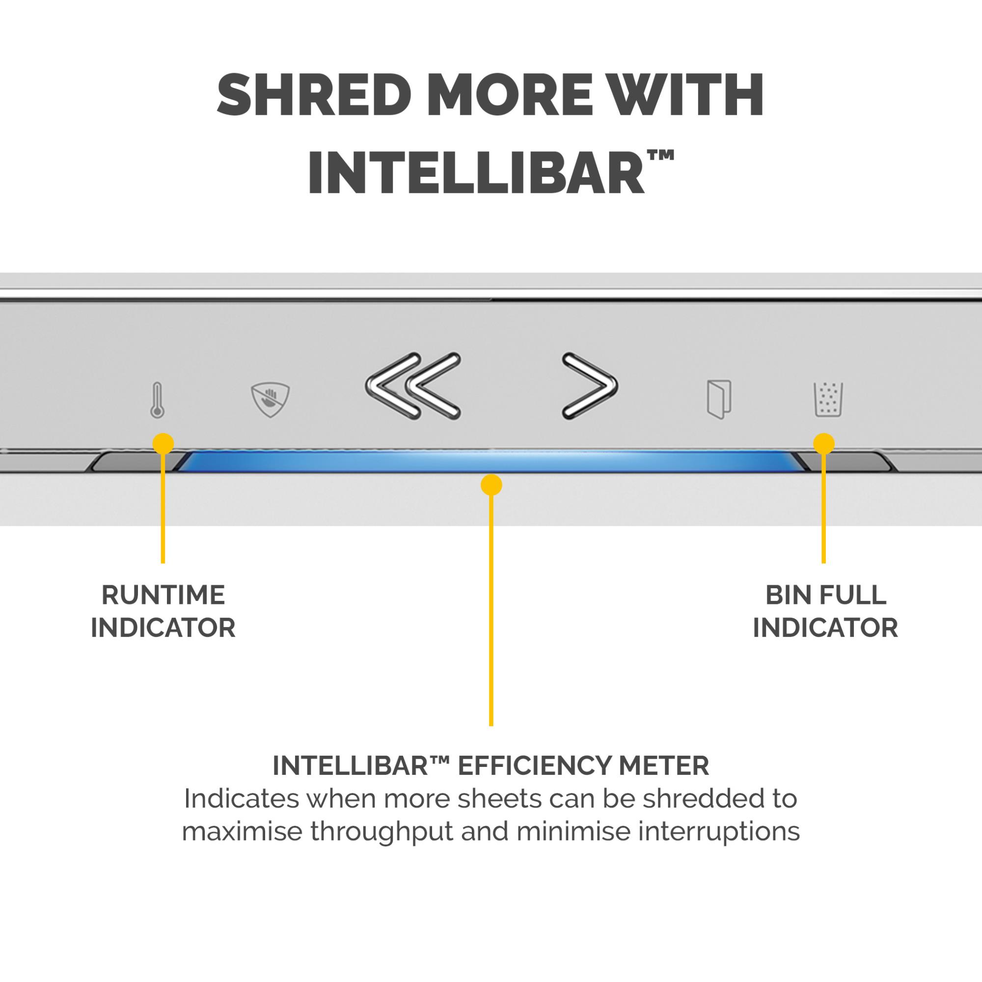• MAXIMISE SHREDDING PERFORMANCE – The Intellibar responsive technology provides in-use feedback that maximises shredder performance – preventing interruptions by indicating when bin & sheet capacity is nearing the limit, or the run time is close to being reached