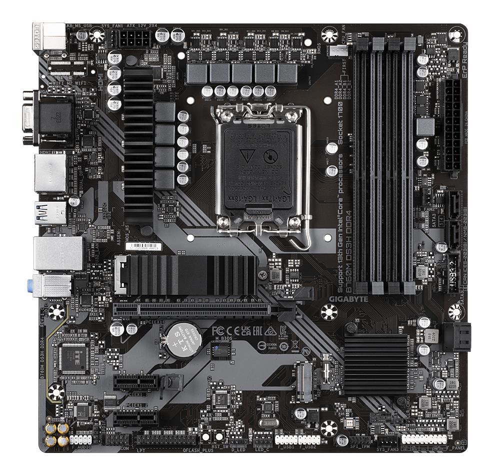Summary GIGABYTE B760M DS3H DDR4 Motherboard – Supports Intel Core 14th Gen CPUs, 6+2+1 Phases Digital VRM, up to 5333MHz DDR4 (OC), 2xPCIe 4.0 M.2, 2.5GbE LAN, USB 3.2 Gen2. Processor manufacturer: Intel, Processor socket: LGA 1700, Compatible processor series: Intel® Celeron®, Intel® Core™ i3, Intel® Core™ i5, Intel® Core™ i7, Intel® Core™ i9,…. Supported memory types: DDR4-SDRAM, Maximum internal memory: 128 GB, Memory slots type: DIMM. Supported storage drive interfaces: M.2, SATA III, Supported storage drive types: HDD & SSD, RAID levels: 0, 1, 5, 10. Maximum resolution: 4096 x 2304 pixels. Ethernet interface type: 2.5 Gigabit Ethernet