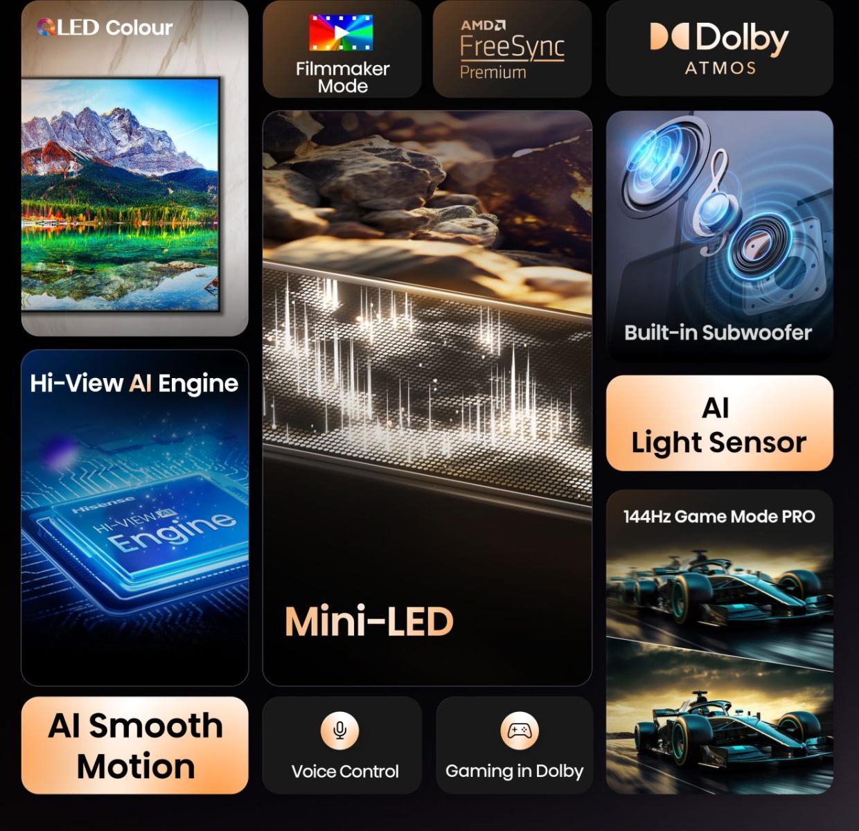 | Hisense technologies (AV/TV) | 4K AI Upscaler/AI Sports mode/Full Array Local Dimming/Game Mode Pro/Hi-View Engine/MEMC (Motion Estimation Motion Compensation) |