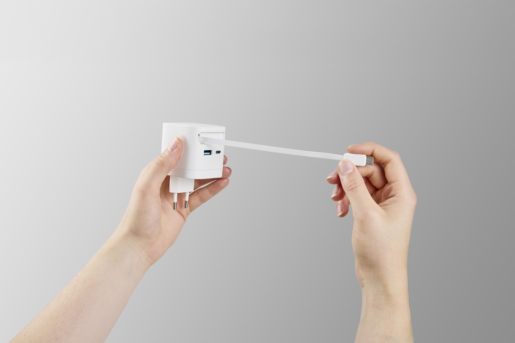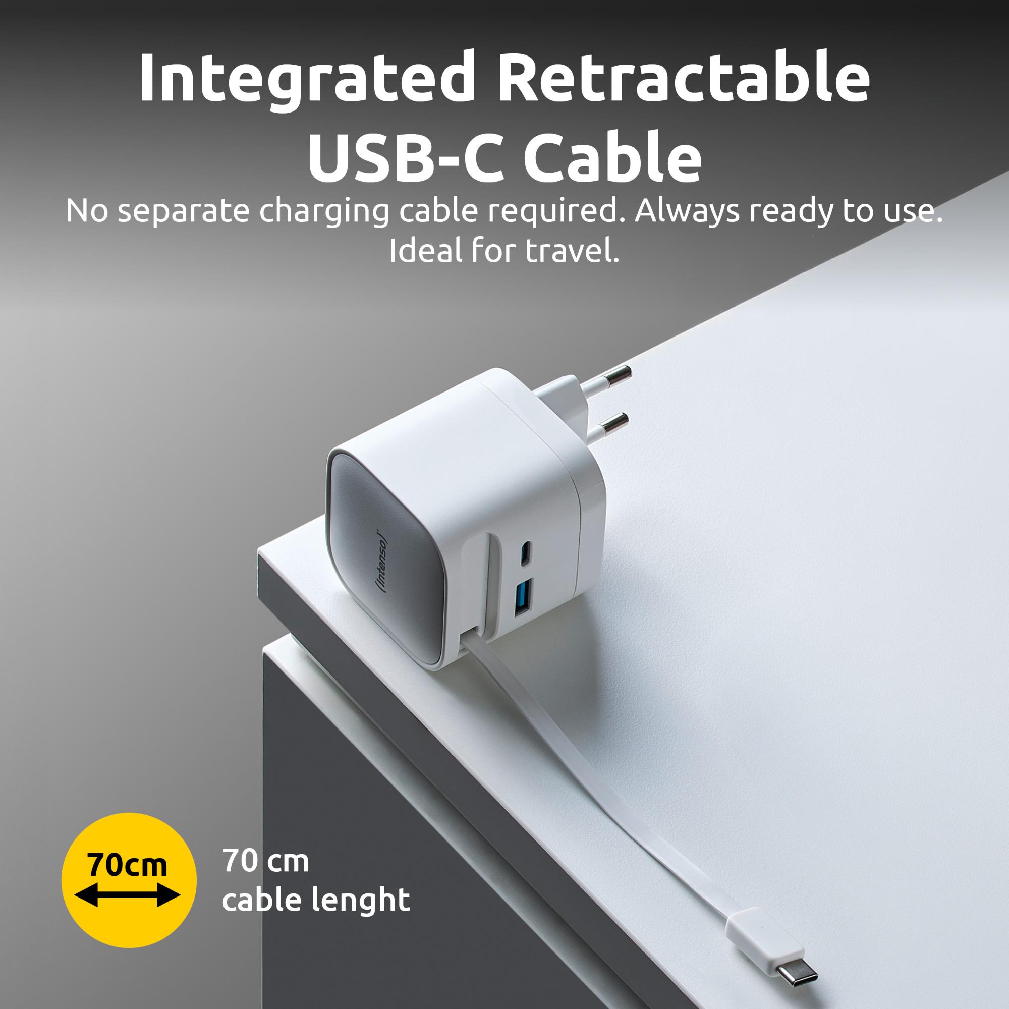 - 65 W USB-C power adapter with integrated retractable USB-C cable
