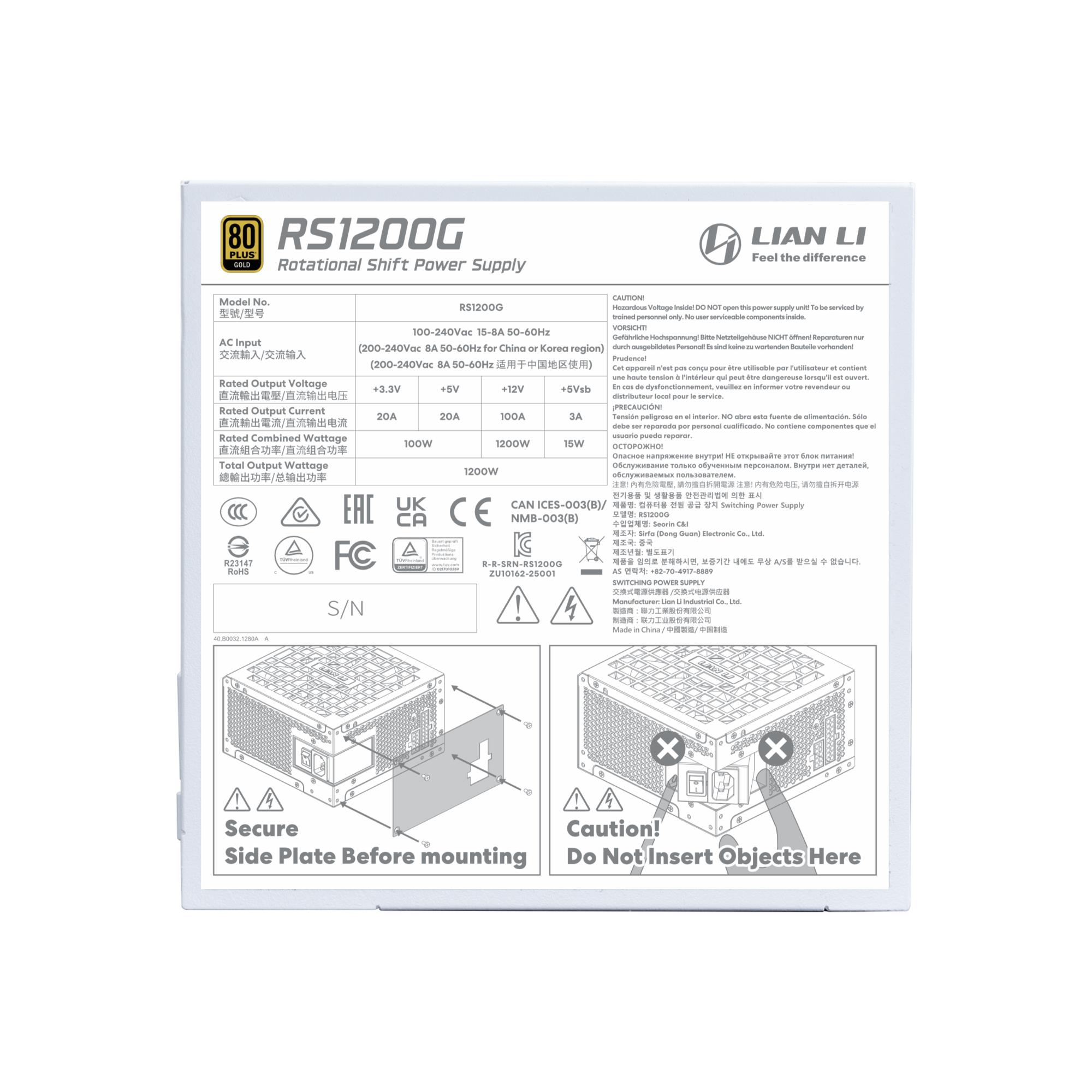 Lian Li RS1200G. Total power: 1200 W, AC input voltage: 100 - 240 V, AC input frequency: 50/60 Hz. Motherboard power connector: 20+4 pin ATX, Motherboard power cable length: 62 cm, Peripheral (Molex) power cable length: 500 mm. Purpose: PC, Power supply unit (PSU) form factor: ATX, 80 PLUS certification: 80 PLUS Gold. Product colour: White, Fan diameter: 13.5 cm, Number of fans: 1 fan(s). Width: 86 mm, Depth: 150 mm, Height: 150 mm