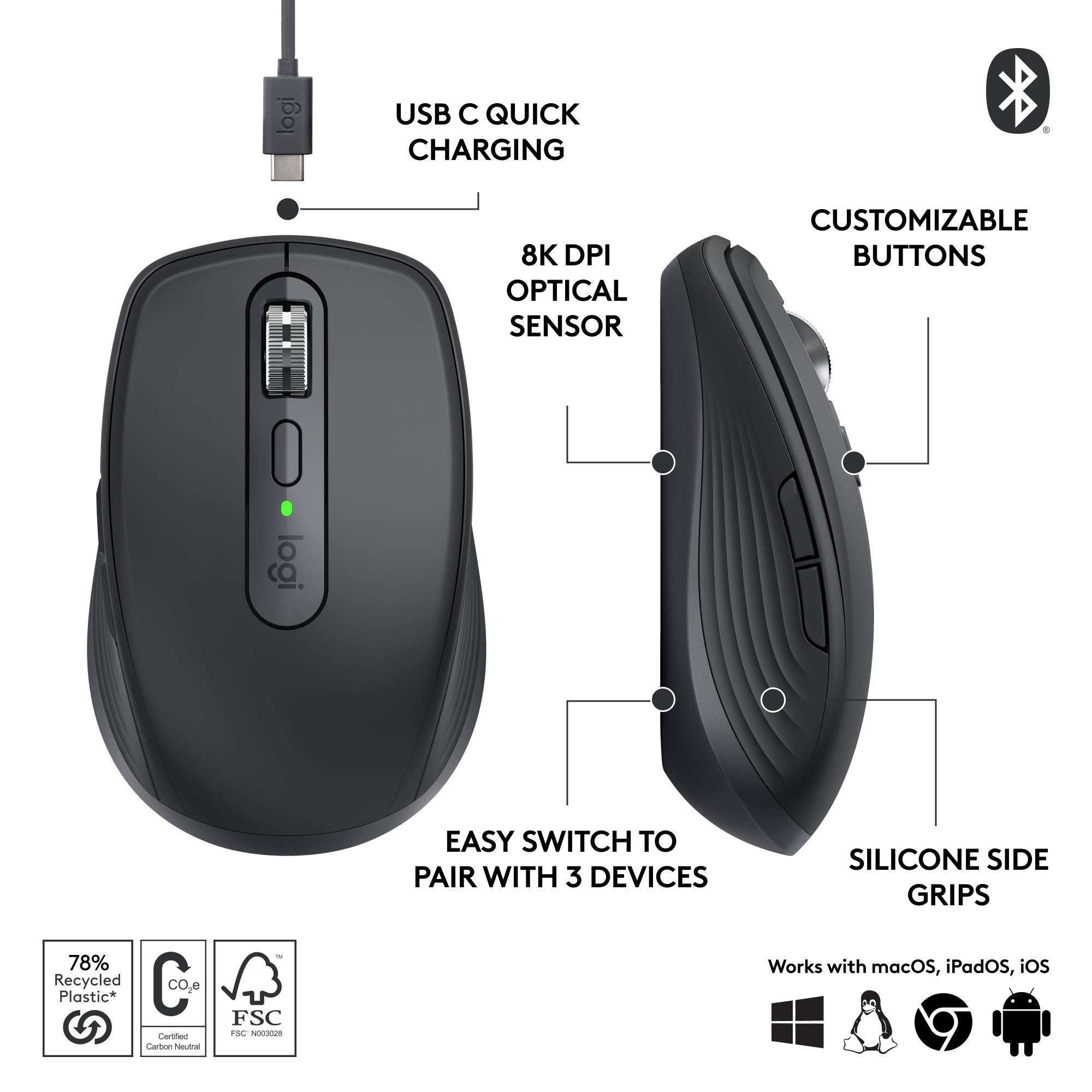 - Made with Recycled Plastic: Plastic parts in MX Anywhere 3S include certified post-consumer recycled plastic – 78% for Graphite, 61% for Pale Grey and Rose