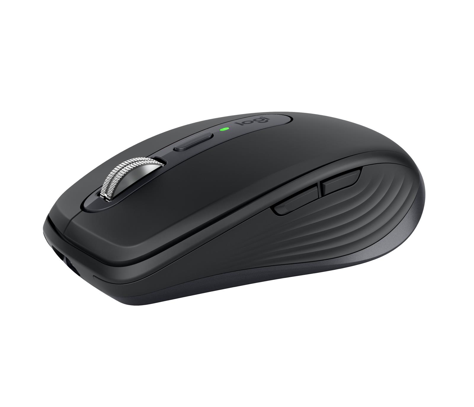 Summary: Logitech MX Anywhere 3S. Form factor: Right-hand. Movement detection technology: Laser, Device interface: RF Wireless + Bluetooth, Movement resolution: 8000 DPI, Buttons type: Pressed buttons, Buttons quantity: 6, Scroll type: Wheel. Power source: Batteries. Works on any surface. Product colour: Graphite