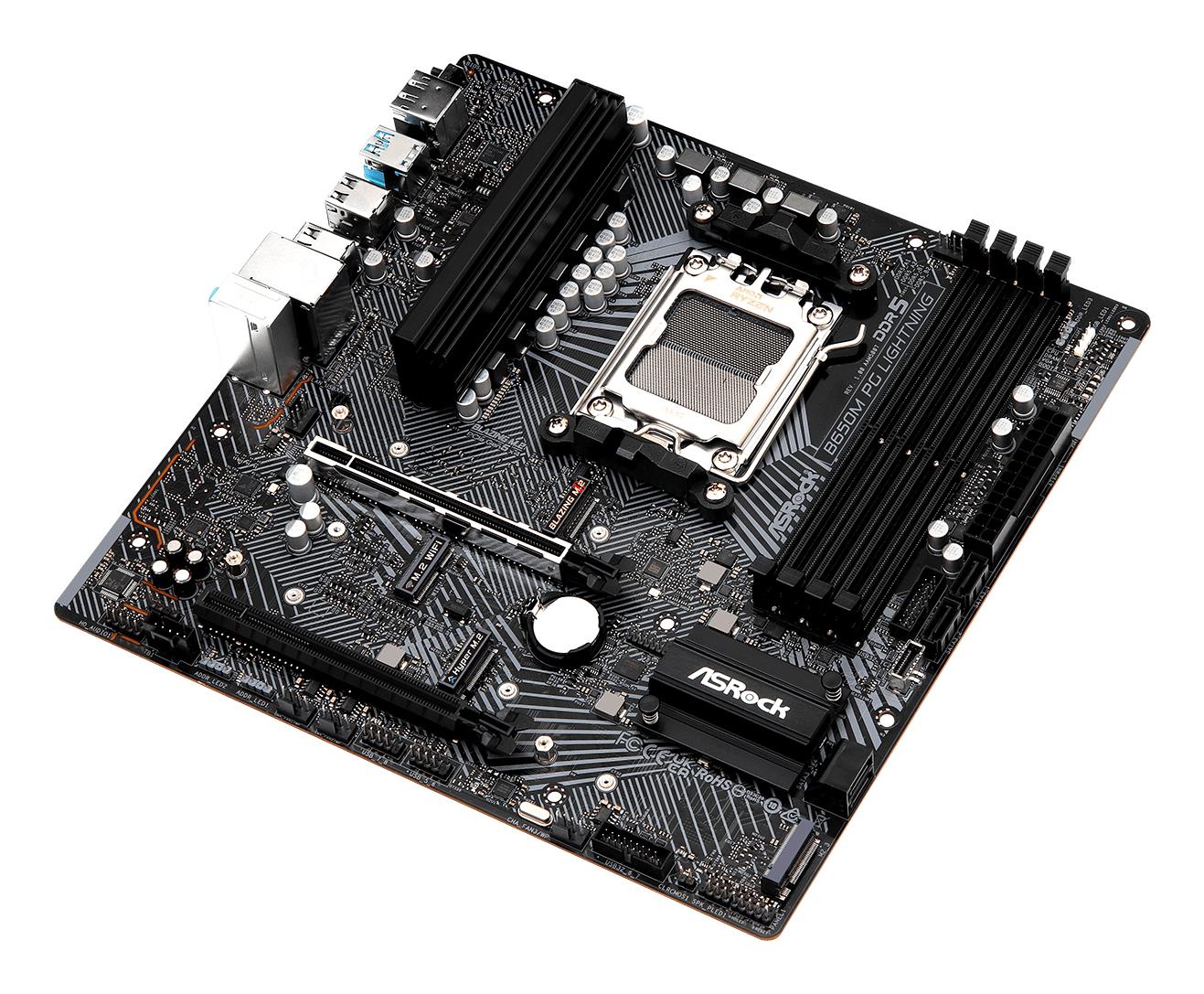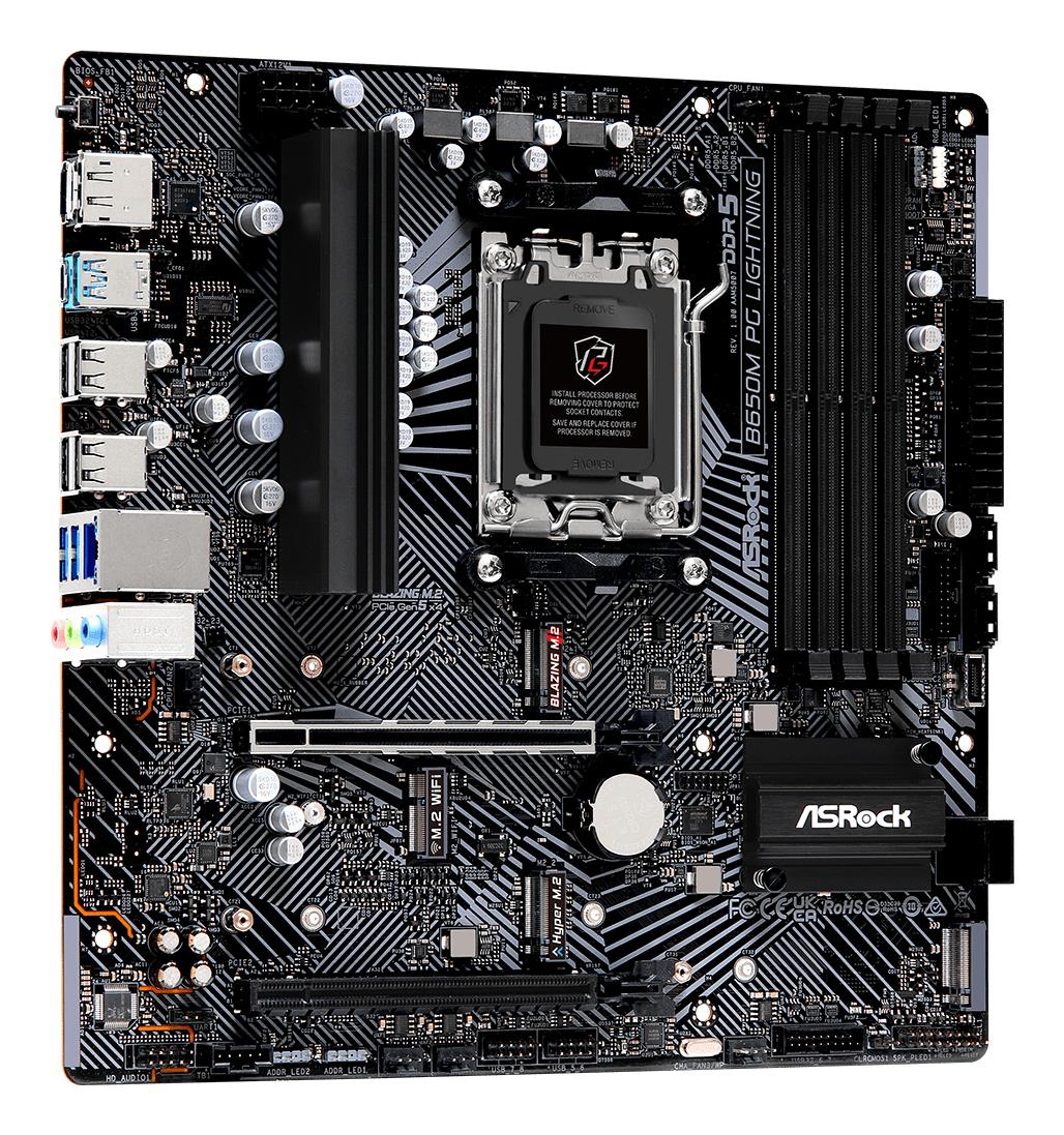 Asrock B650M PG Lightning. Processor manufacturer: AMD, Processor socket: Socket AM5, Compatible processor series: AMD Ryzen 7000 Series. Supported memory types: DDR5-SDRAM, Maximum internal memory: 192 GB, Memory slots type: DIMM. Supported storage drive interfaces: M.2, PCI Express 4.0, PCI Express 5.0, SATA III, Supported storage drive types: HDD & SSD, RAID levels: 0, 1, 10. Parallel processing technology support: CrossFire, Maximum resolution: 3840 x 2160 pixels. USB connector type: USB Type-A, USB Type-C