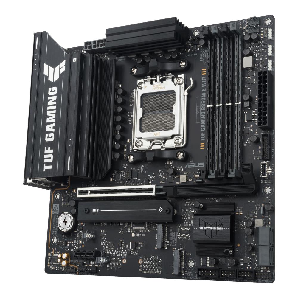 ASUS TUF GAMING B850M-E WIFI takes all the essential elements of the latest AMD Ryzen™ processors and combines them with game-ready features and proven durability. Engineered with military-grade components, an upgraded power solution and a comprehensive cooling system, this motherboard goes beyond expectations with rock-solid and stable performance for marathon gaming. TUF GAMING motherboards also undergo rigorous endurance testing to ensure that they can handle conditions where others may fail. This platform delivers the power and connectivity that advanced AI PC applications demand.