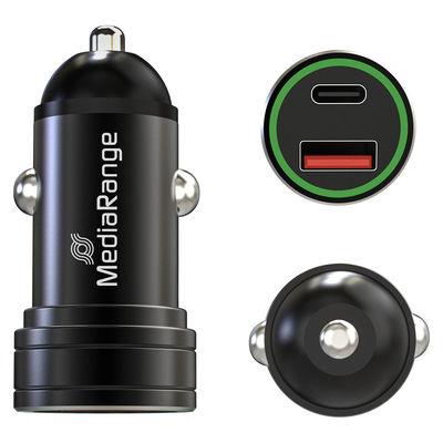 MediaRange 20W In-car charger with 1x USB-A and 1x USB-C port, black aluminium housing