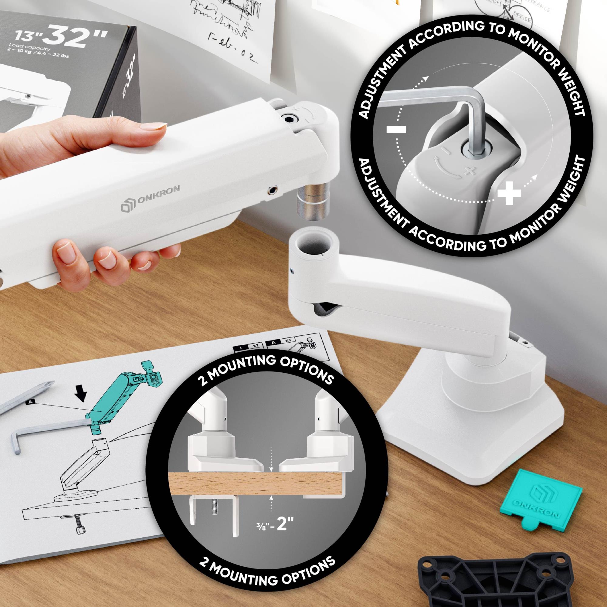 ONKRON G80-BW. Mounting: Clamp, Maximum weight capacity: 22.1 kg, Minimum screen size: 33 cm (13"), Maximum screen size: 81.3 cm (32"), Minimum VESA mount: 75 x 75 mm, Maximum VESA mount: 100 x 100 mm. Height adjustment, Tilt angle range: -45 - 90°. Product colour: White, Black