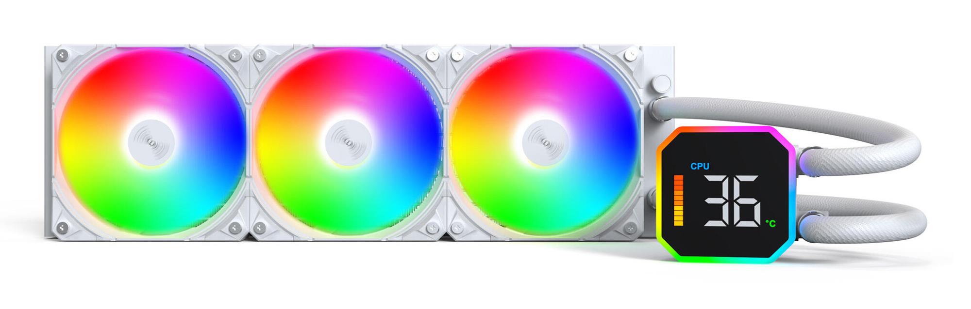 Montech HyperFlow Digital 360. Type: All-in-one liquid cooler, Fan diameter: 12 cm, Airflow: 129.5 m³/h, Maximum air pressure: 96.27 mmH2O, Bearing type: Fluid Dynamic Bearing (FDB). Product colour: White