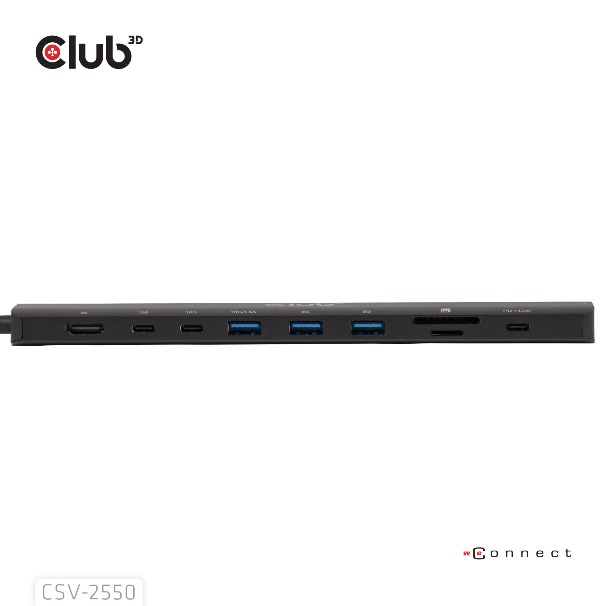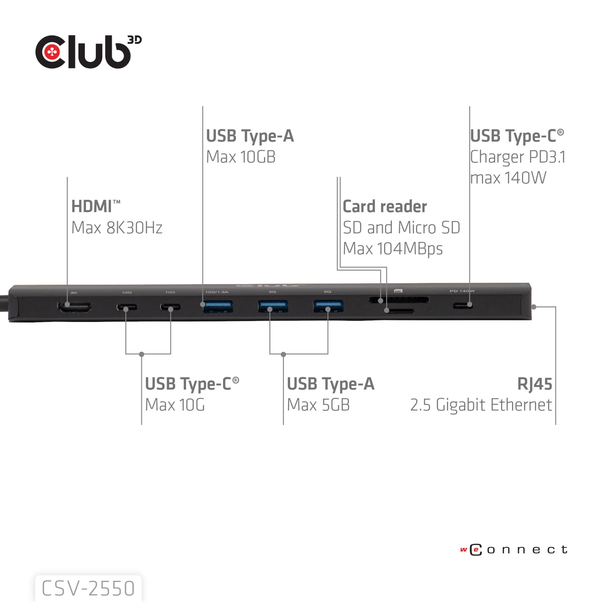 The Club 3D CSV-2550 is a 10-1 Portable Dock USB-C® 10Gbps to HDMI™ 8K30Hz PD3.1 Max.140Watt, providing an ideal solution for extending the port of USB-C® or Thunderbolt™® host (PC/Laptop/Mobile phone, etc.), especially for those host with a single USB-C® port. This hub enables to output HDMI™ with max 8K30Hz or 4K144Hz high refresh rate for more natural and smoother visual experience at the meanwhile transfer USB 10Gbps data. 3x USB Type-A and 2x USB-C® data ports allow you to connect 5 USB devices simultaneously. SD/Micro SD allow to insert 2 card slots simultaneously for data transmission or for reading/writing information on the host. RJ45 port allows the host to get access to 2.5 Gigabit Ethernet. Besides, the USB-C® female supports PD 3.1 with max 140W PD Charging. It can work on all DP Alt mode supported USB-C® hosts.