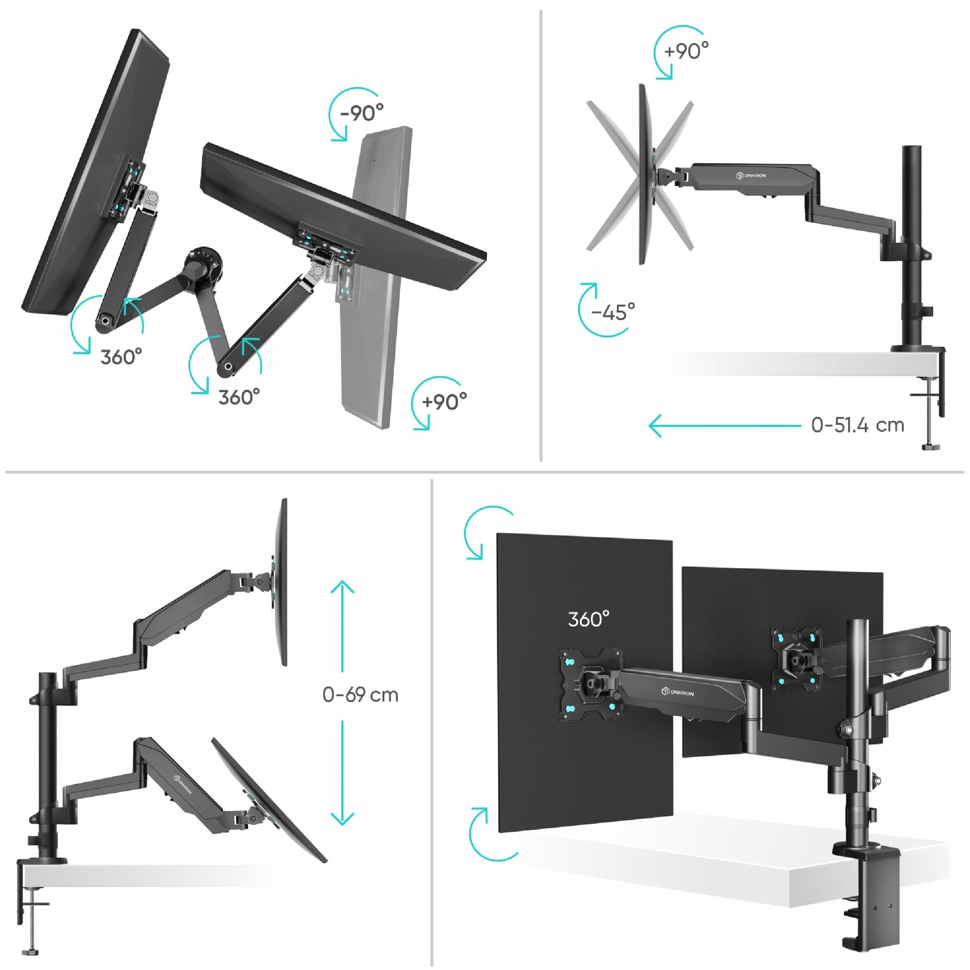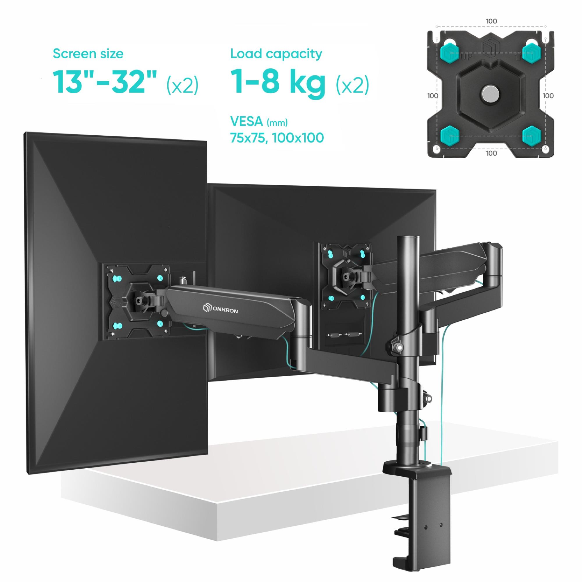 ONKRON G140-B. Mounting: Clamp/Grommet, Maximum weight capacity: 8 kg, Minimum screen size: 33 cm (13"), Maximum screen size: 81.3 cm (32"), Minimum VESA mount: 75 x 75 mm, Maximum VESA mount: 100 x 100 mm. Height adjustment, Tilt angle range: -45 - 90°. Product colour: Black