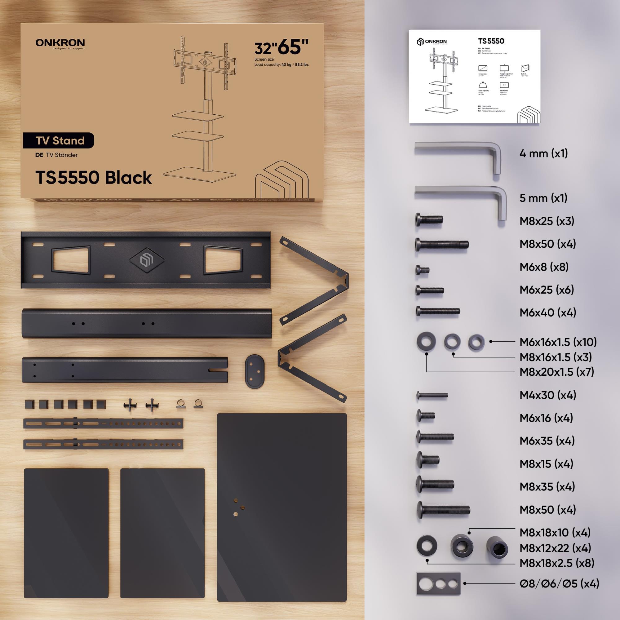 ONKRON TS5550-B. Maximum weight capacity: 30 kg, Minimum screen size: 81.3 cm (32"), Maximum screen size: 165.1 cm (65"), Minimum VESA mount: 100 x 100 mm, Maximum VESA mount: 600 x 400 mm. Height adjustment range: 880 - 1080 mm, Swivel angle range: -25 - 25°, Angle of rotation: 50°, Distance to the wall (max): 3.9 cm. Product colour: Black