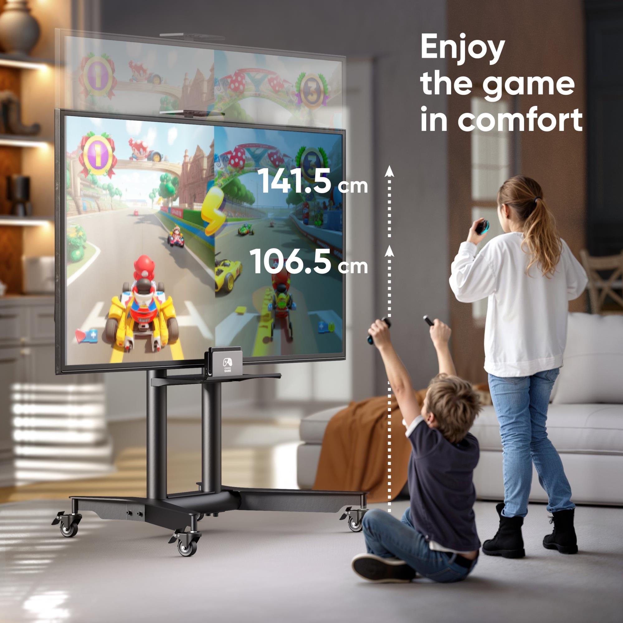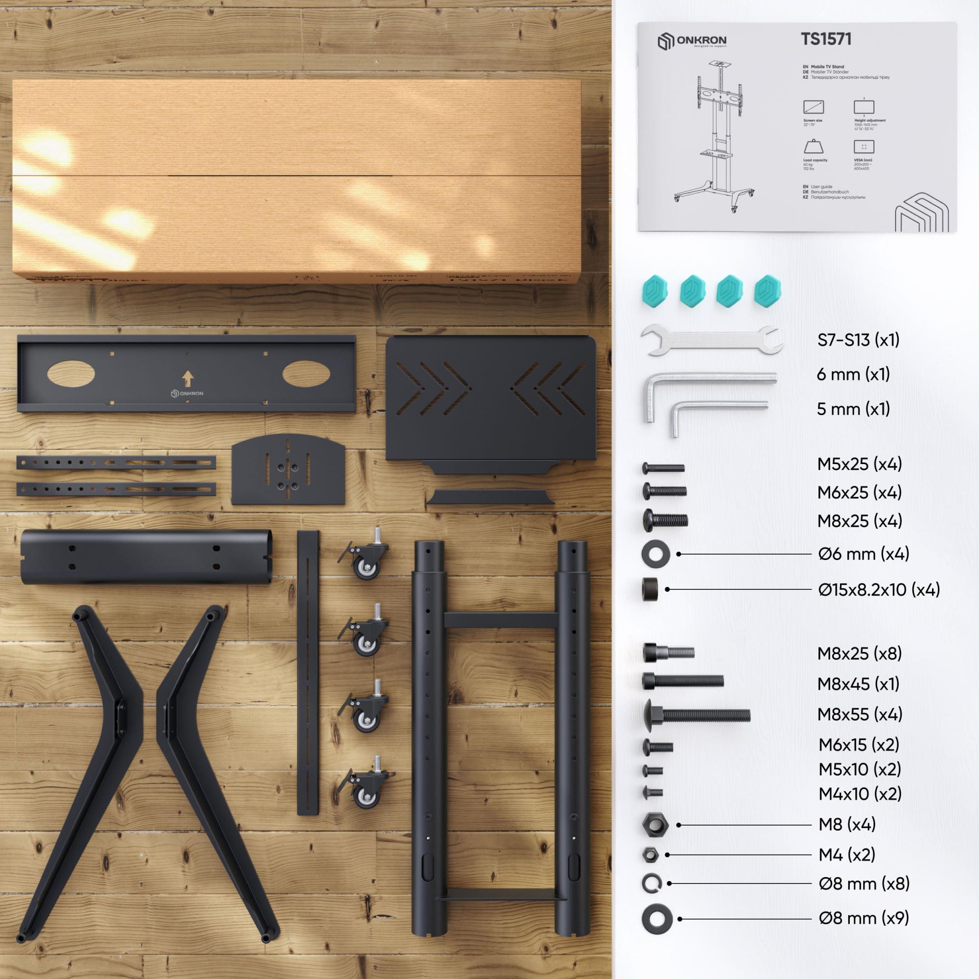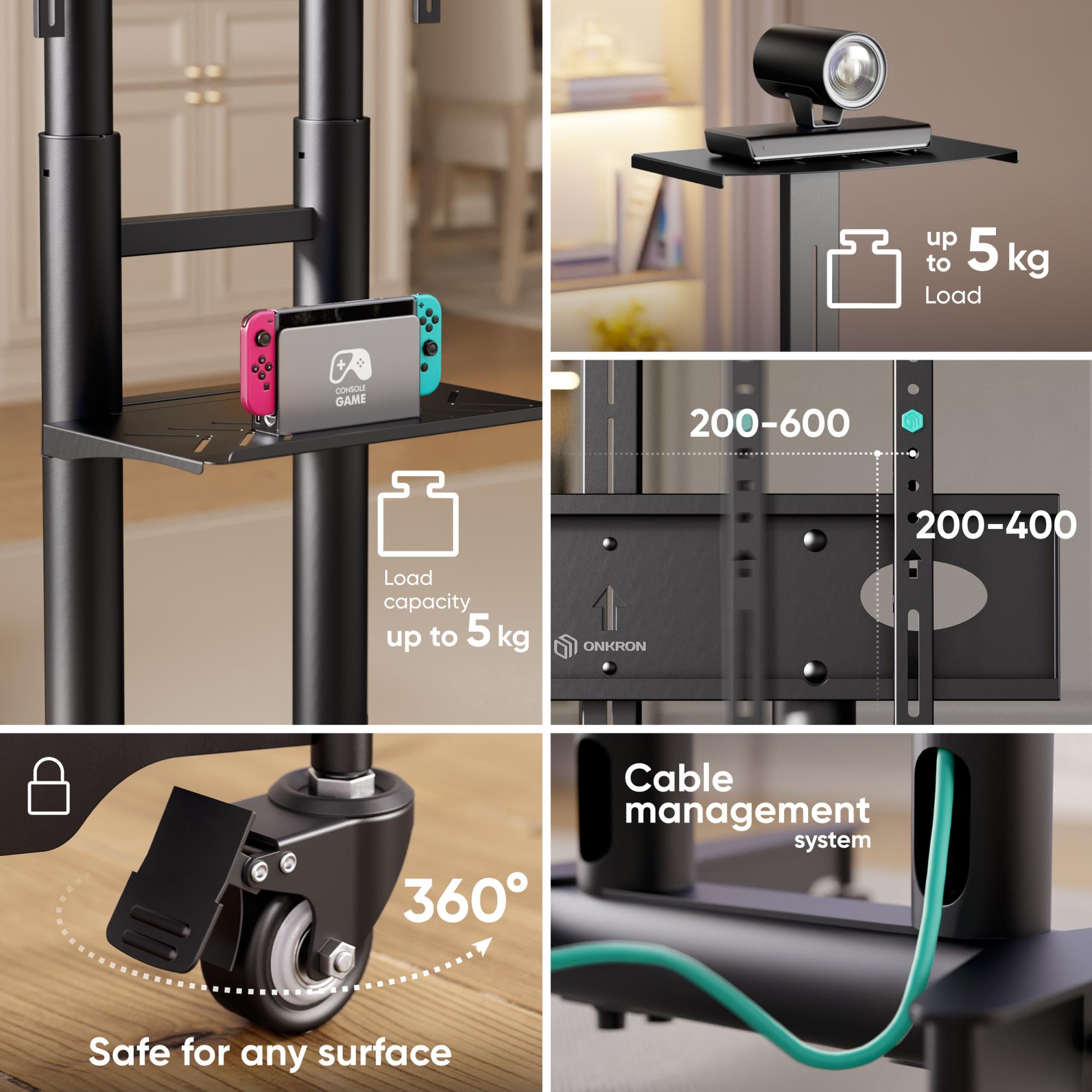 Summary ONKRON TS1571-B. Maximum weight capacity: 60 kg, Minimum screen size: 81.3 cm (32"), Maximum screen size: 190.5 cm (75"), Minimum VESA mount: 200 x 200 mm, Maximum VESA mount: 600 x 400 mm. Height adjustment range: 1065 – 1415 mm. Product colour: Black