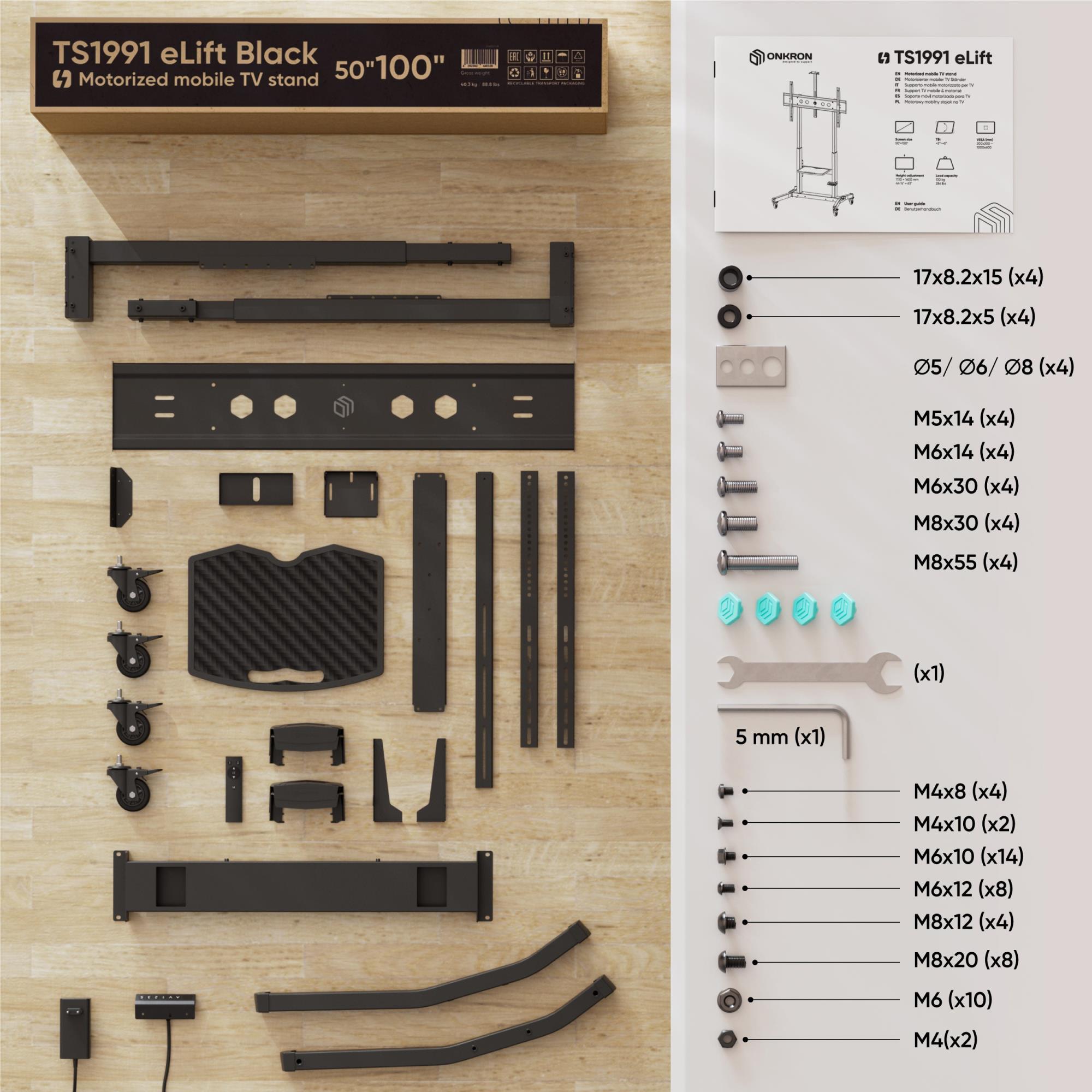ONKRON TS1991E-B. Maximum weight capacity: 130 kg, Minimum screen size: 127 cm (50"), Maximum screen size: 2.54 m (100"), Minimum VESA mount: 200 x 200 mm, Maximum VESA mount: 1000 x 600 mm. Height adjustment range: 1130 – 1600 mm, Tilt angle range: -5 – 5°. Product colour: Black