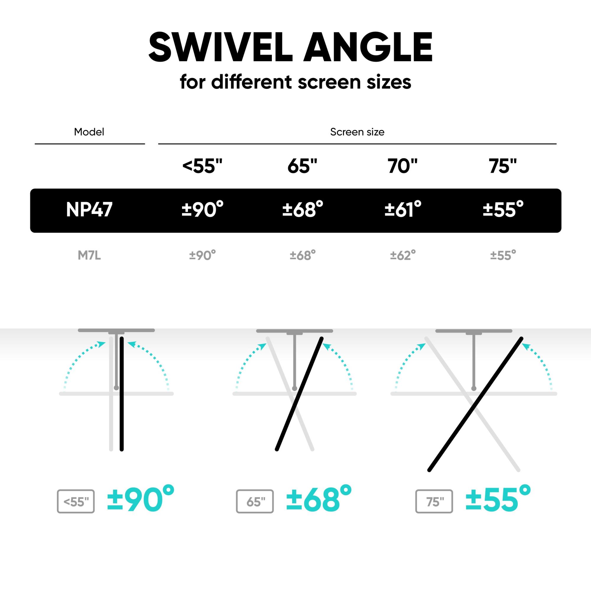 NP47 has a very long mounting arm, reaching 27.9” (709 mm) from the wall, when fully extended. Due to that feature you can turn bigger screens and have the most comfortable viewing angels from every corner of your room.