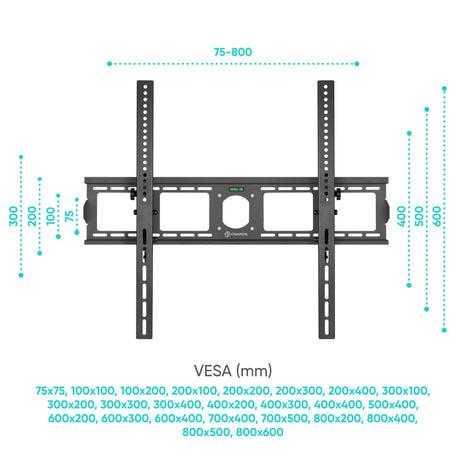 ONKRON UT4-B. Maximum weight capacity: 75 kg, Minimum screen size: 139.7 cm (55"), Maximum screen size: 2.54 m (100"), Minimum VESA mount: 75 x 75 mm, Maximum VESA mount: 800 x 600 mm. Tilt angle range: 0 - 15°, Distance to the wall (max): 7.8 cm. Product colour: Black