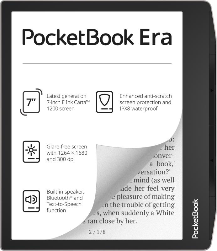 | Summary | PocketBook 700 Era Silver. Display diagonal: 17.8 cm (7"), Technology: E Ink Carta, Display resolution: 1264 x 1680 pixels. Document formats supported: ACSM, DOCX, DjVu, PRC, EPUB DRM, MOBI, RTF, FB2, FB2.ZIP, PDF, CBR, HTM, TXT, CBZ, HTML, CHM,…, Audio formats supported: MP3, OGG, Image formats supported: PNG, BMP, TIFF, JPEG. Internal storage capacity: 16 GB, RAM capacity: 1000 MB. Processor frequency: 1000 MHz. USB connector type: USB Type-C |
