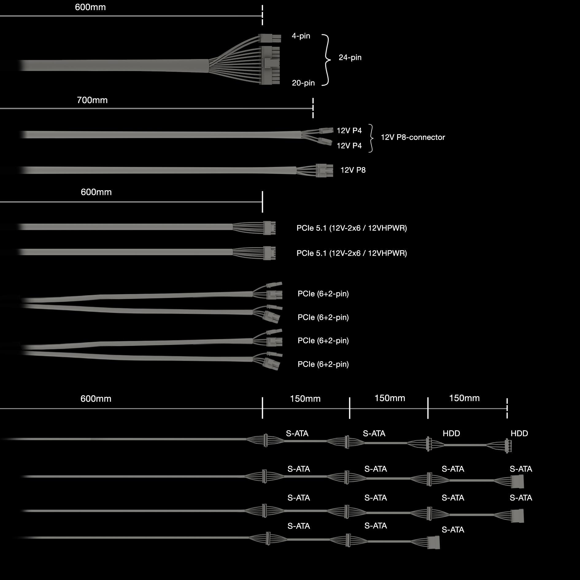 SATA power cable length: 1050/600/750/900