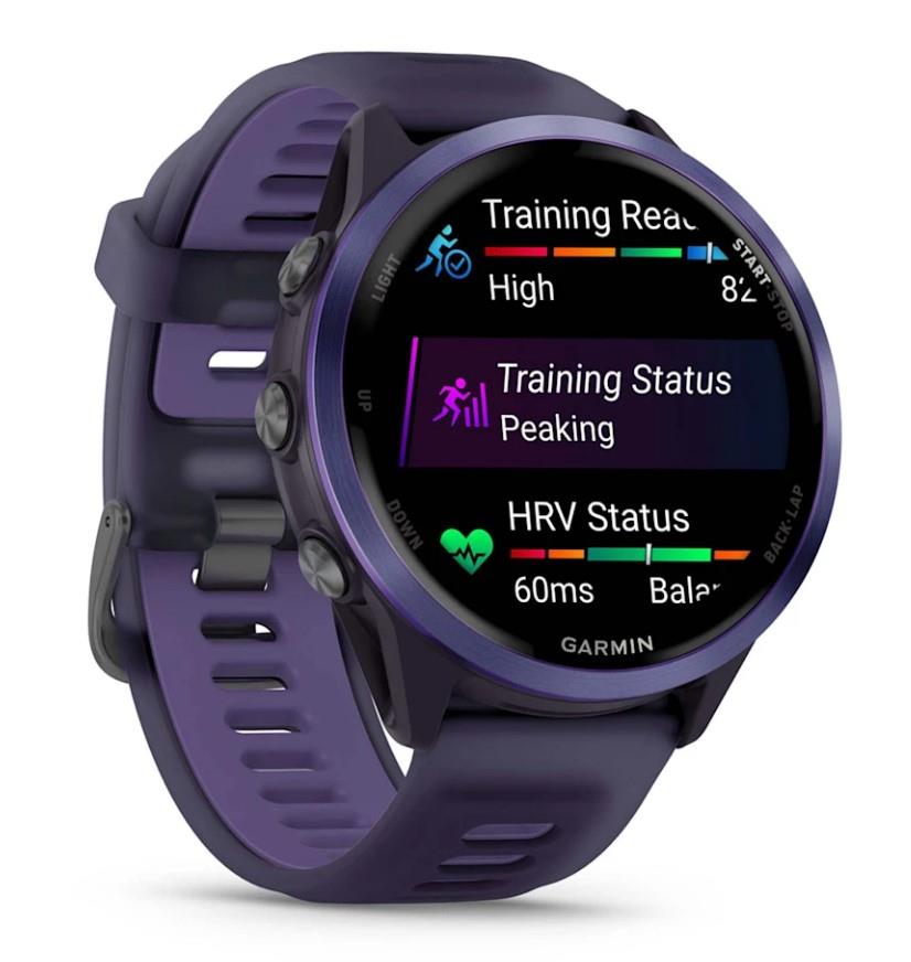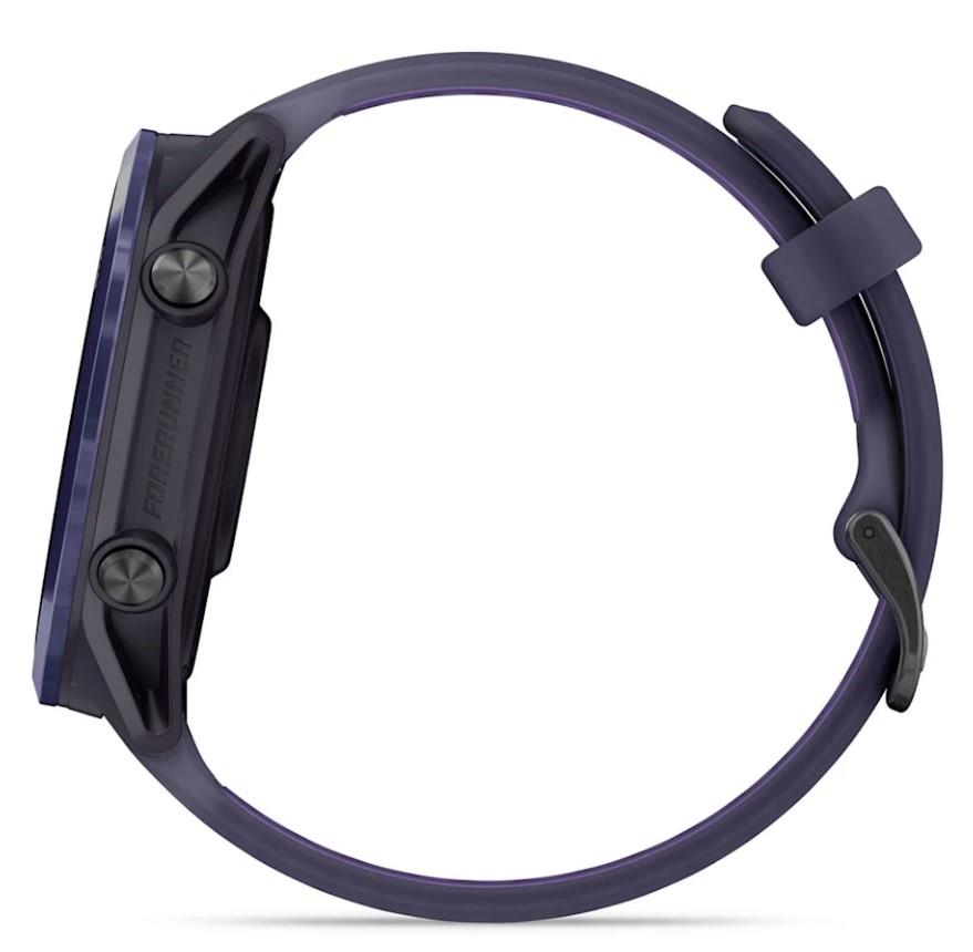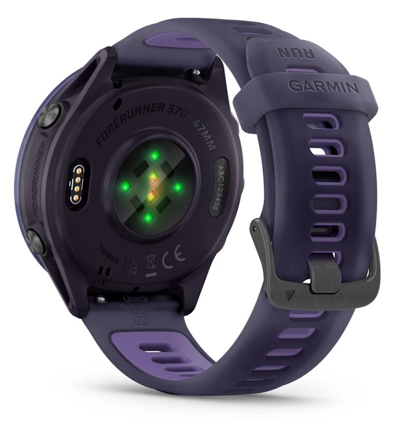 Summary: Garmin Forerunner 570. Display diagonal: 3.56 cm (1.4″), Display technology: AMOLED, Display resolution: 454 x 454 pixels, Touchscreen. Flash memory: 8 GB. Wi-Fi. GPS (satellite). Weight: 50 g. Band material: Silicone, Band colour: Violet