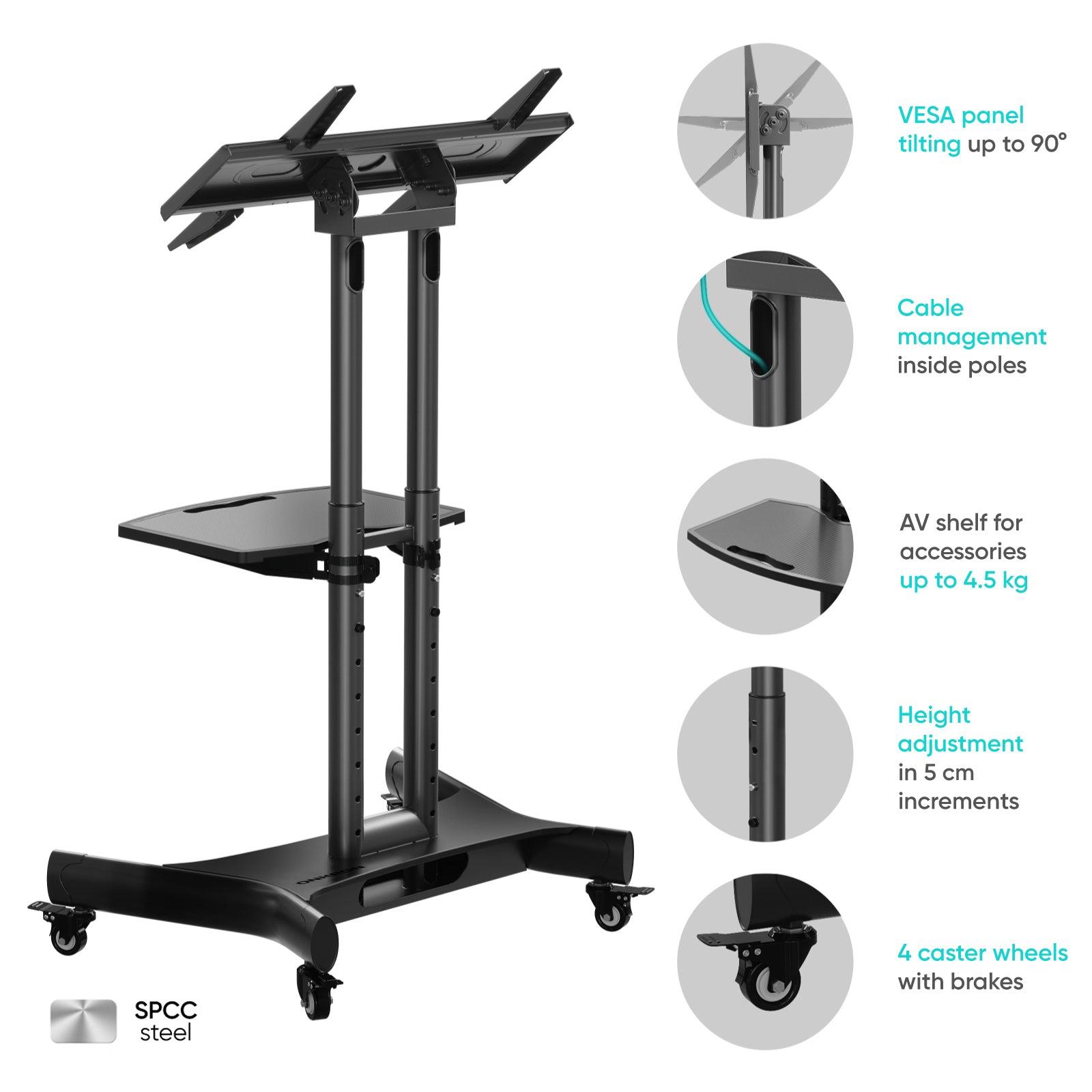 Summary: ONKRON TS1350-B. Maximum weight capacity: 40.5 kg, Minimum screen size: 81.3 cm (32″), Maximum screen size: 177.8 cm (70″), Minimum VESA mount: 100 x 100 mm, Maximum VESA mount: 600 x 400 mm. Height adjustment range: 870 – 1175 mm, Tilt angle range: 0 – 90°. Product colour: Black