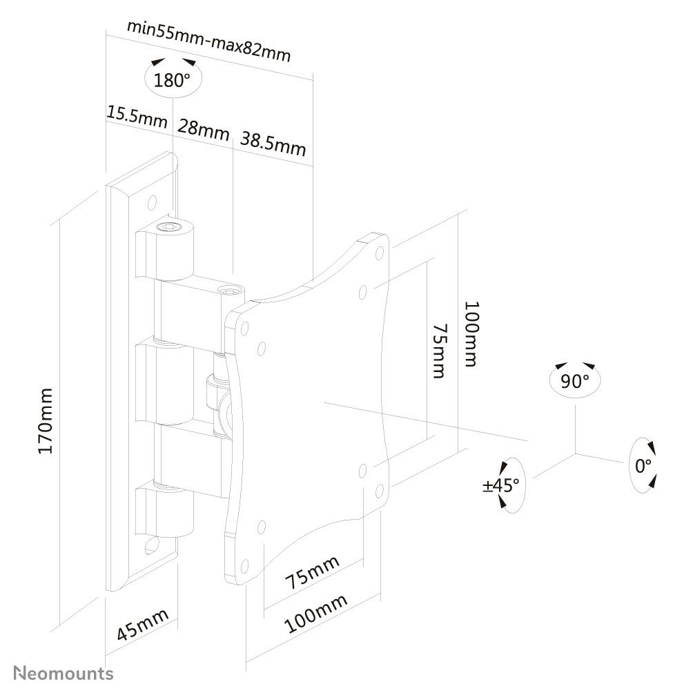 | Summary | Neomounts FPMA-W810BLACK Monitor/TV mount wall 10-27" – full motion. Maximum weight capacity: 12 kg, Minimum screen size: 25.4 cm (10"), Maximum screen size: 68.6 cm (27"), Minimum VESA mount: 75 x 75 mm, Maximum VESA mount: 100 x 100 mm. Tilt angle range: 0 – 90°, Swivel angle range: 0 – 90°, Distance to the wall (min): 5 cm, Distance to the wall (max): 8 cm. Product colour: Black |