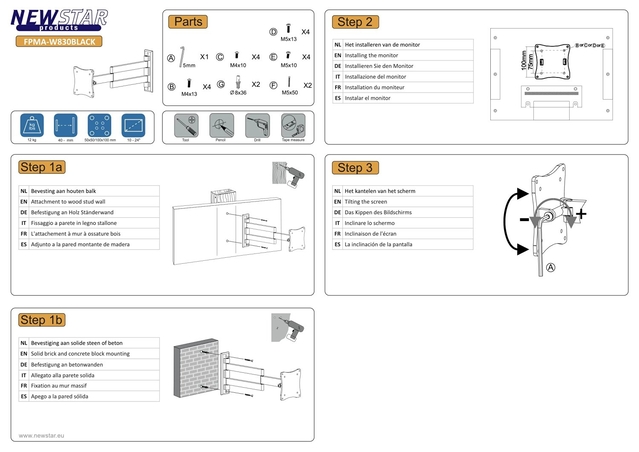 Description: The NewStar wall mount, model FPMA-W830BLACK is a tilt- and swivel wall mount for flat screens up to 24”. This mount is a great choice when you want the ultimate viewing flexibility with your flat screen. Effortless pull the display out from the wall, position it in almost any direction, turn it around corners and then smoothly return it to the wall when finished.