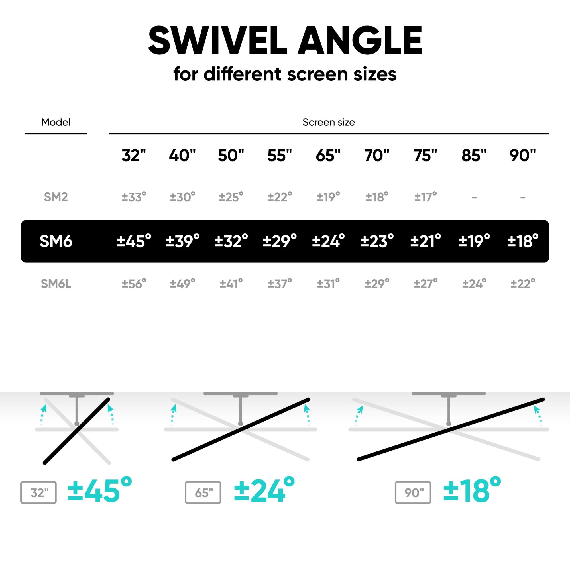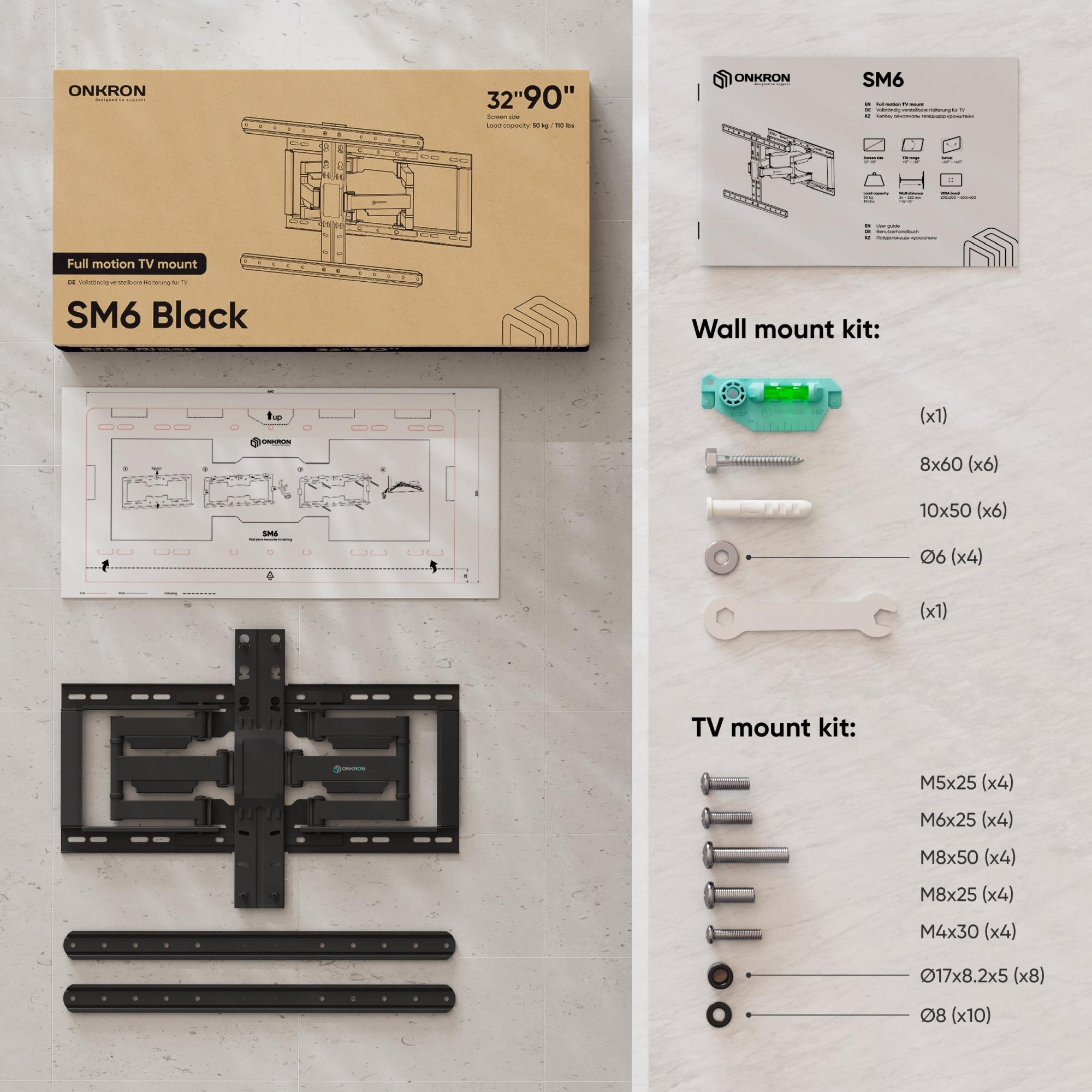 ONKRON SM6-B. Maximum weight capacity: 50 kg, Minimum screen size: 81.3 cm (32"), Maximum screen size: 2.29 m (90"), Minimum VESA mount: 200 x 200 mm, Maximum VESA mount: 600 x 400 mm. Tilt angle range: -10 - 5°, Angle of rotation: 40°, Distance to the wall (min): 3.4 cm, Distance to the wall (max): 33 cm. Product colour: Black