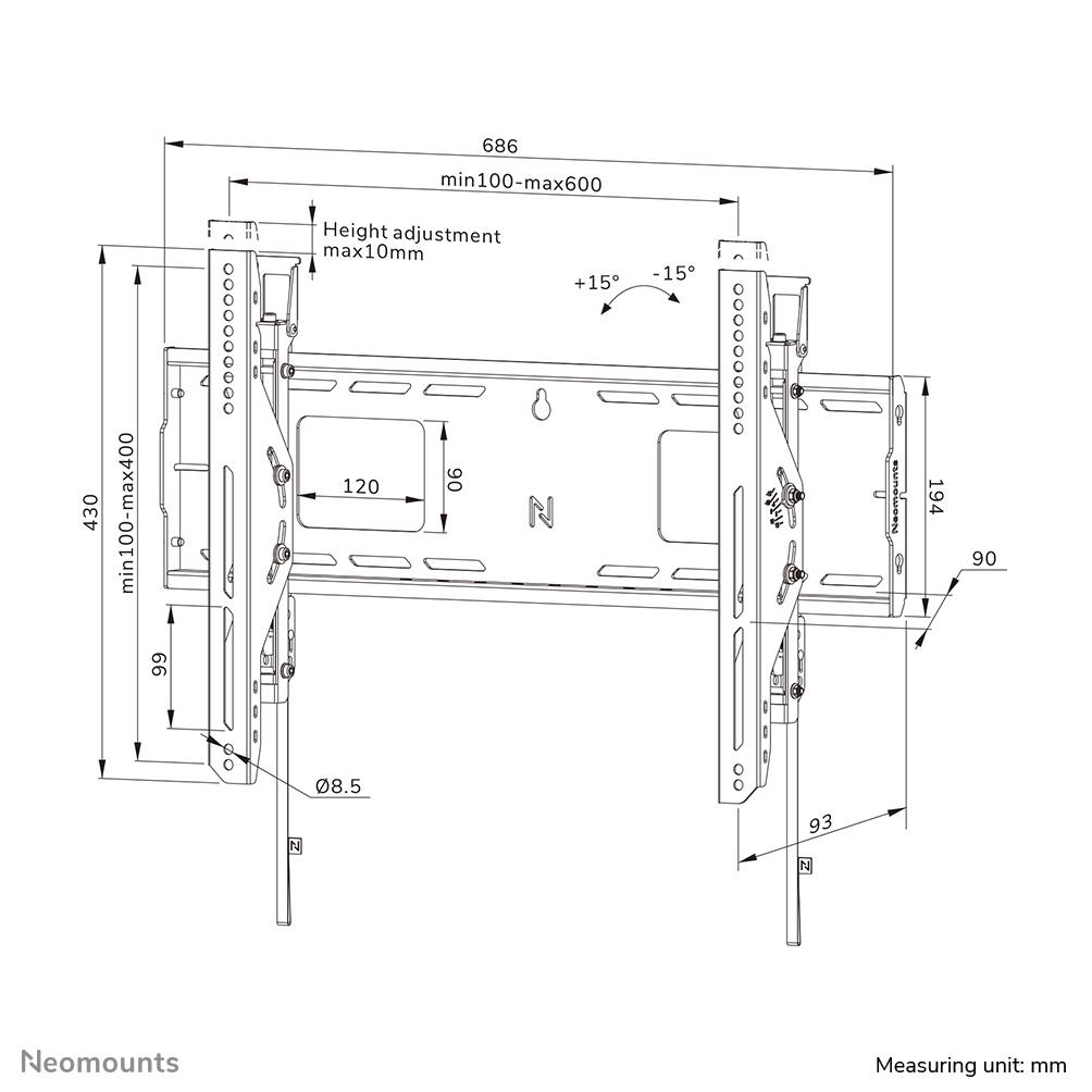 The Neomounts WL35-750BL16 LEVEL is the ultimate tiltable solution for securely mounting an interactive or heavy weight display up to 86" with a maximum capacity of 125 kg. The toolless tilt adjustment (+15°/-15°) allows you to create the optimum viewing angle. This heavy-duty wall mount features a sturdy high profile wall plate and is engineered for stability and precision, ensuring your screen is securely mounted even on uneven surfaces. The mount features individual adjustable brackets (10 mm) for securely adjusting the display height or levelling it.