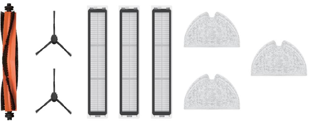 1x main brussh, 2 x side brushes, 3 x filters, 3 x mops