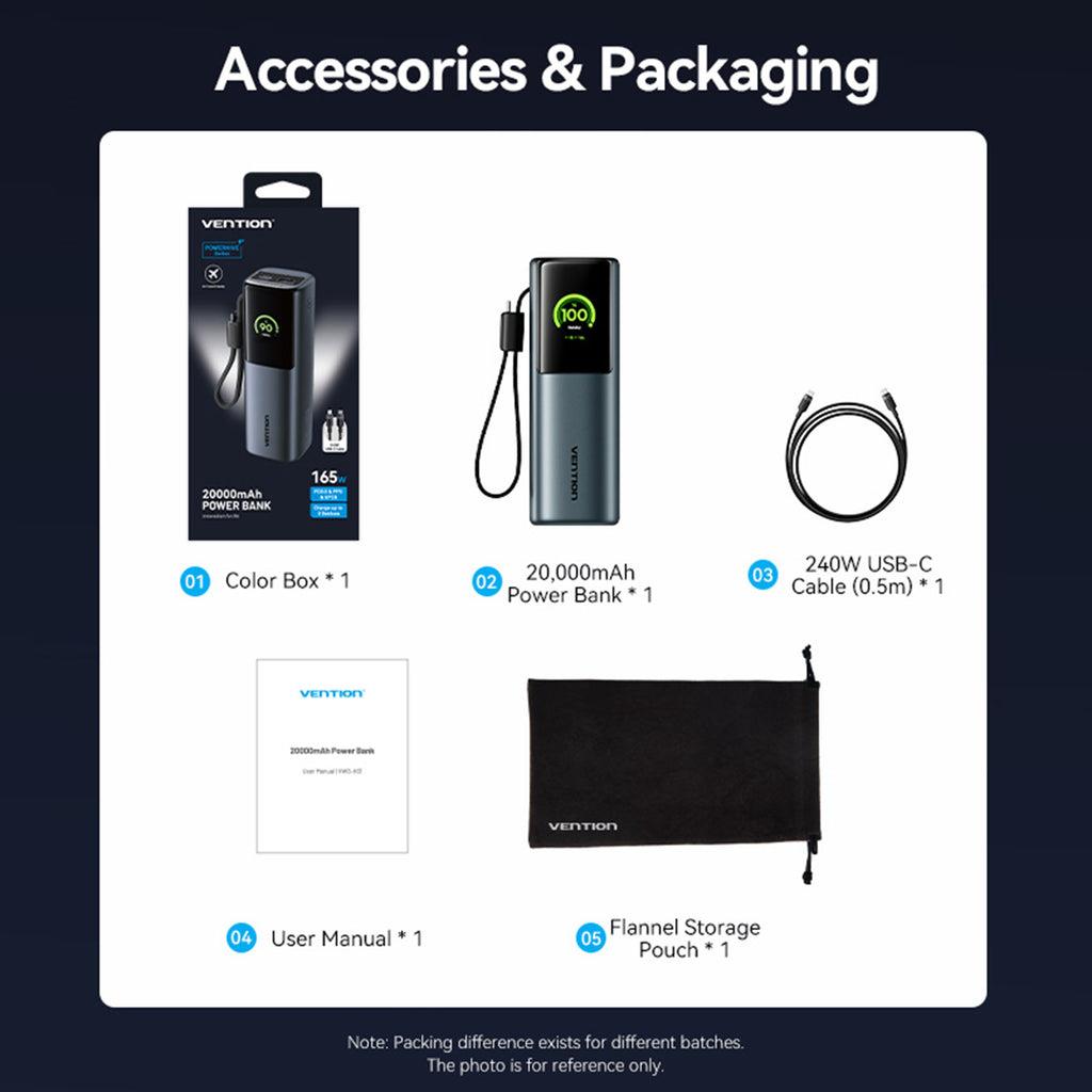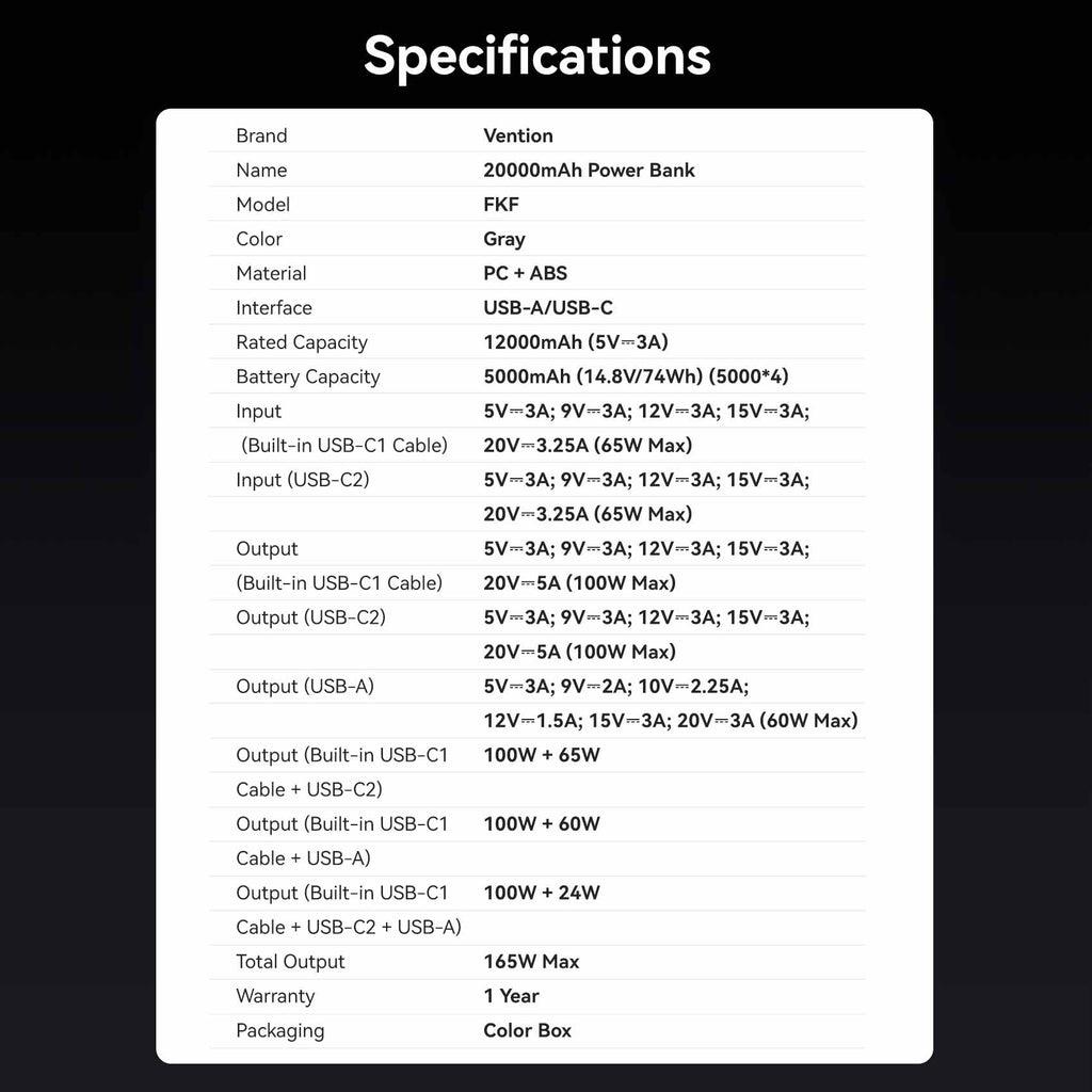 Summary: Vention FKFH0. Battery capacity: 20000 mAh, Fast charging technology: Power Delivery 3.0, Programmable Power Supply (PPS). USB Type-A output ports: 1, USB Type-C ports quantity: 1. Total output power: 165 W, Output current: 5 A. Product colour: Grey